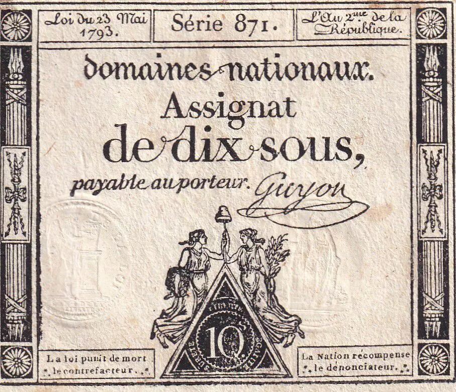 Banknote France 10 Sous - Women with Liberty cap on pole (23-05-1793) - Sign. Guyon - Serial 871 - L.165