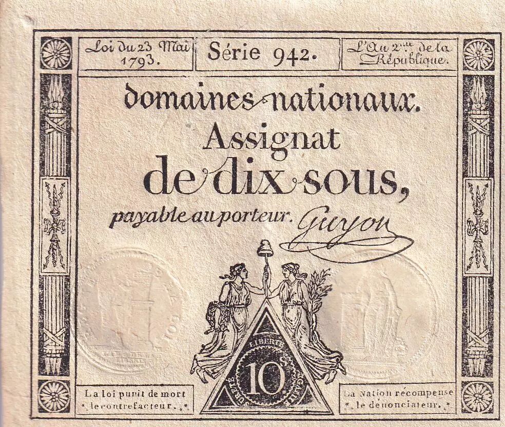 Banknote France 10 Sous - Women with Liberty cap on pole (23-05-1793) - Sign. Guyon - Serial 942 - L.165