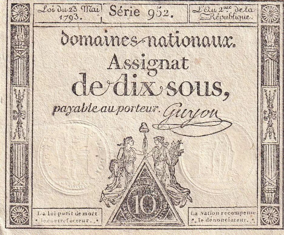 Banknote France 10 Sous - Women with Liberty cap on pole (23-05-1793) - Sign. Guyon - Serial 952 - L.165