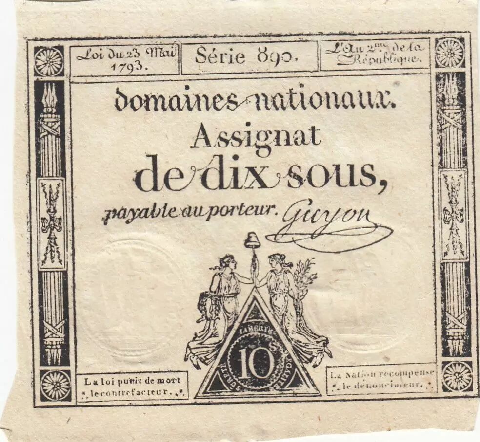 Home > French Banknotes > Assignats > 10 Sols > France 10 Sous - Women with Liberty cap on pole - 23-05-1793 - Sign. Guyon - Série 890