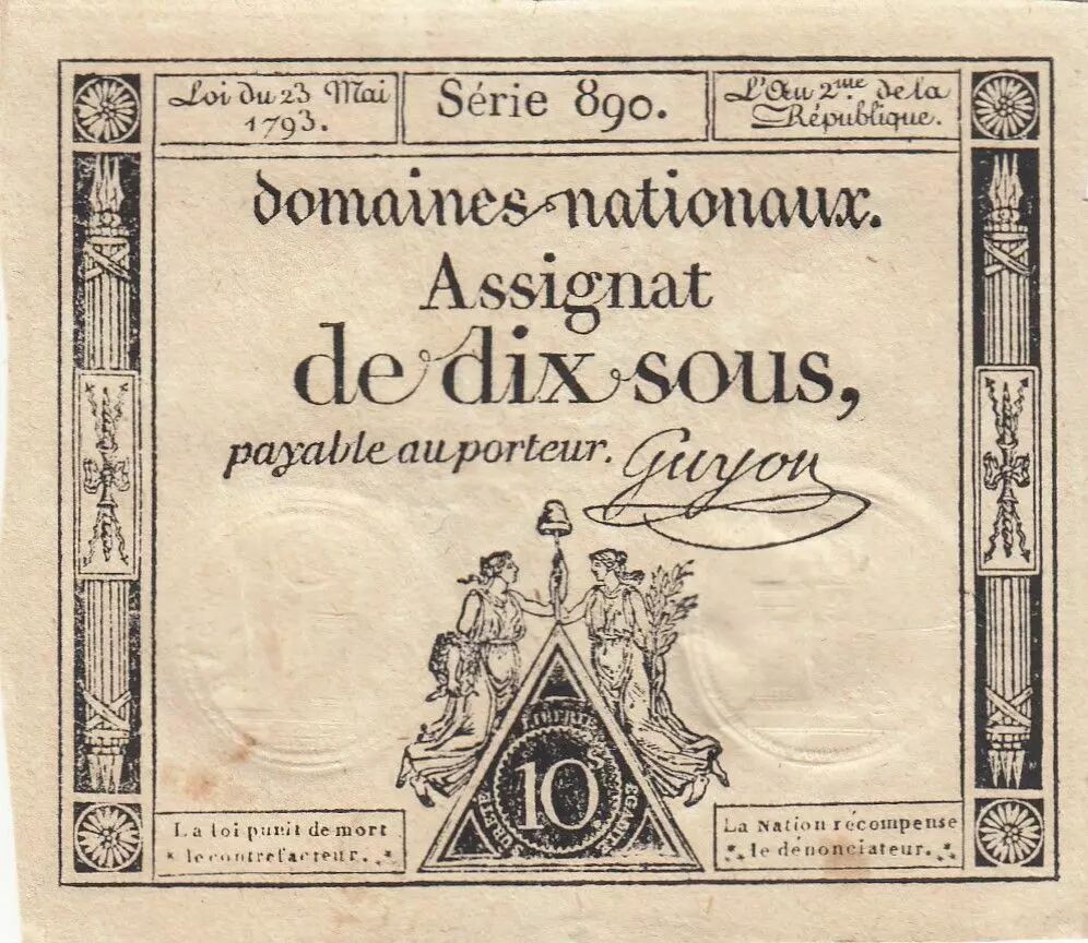 Home > French Banknotes > Assignats > 10 Sols > France 10 Sous - Women with Liberty cap on pole - 23-05-1793 - Sign. Guyon - Série 890