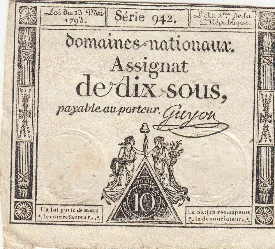 Banknote France 10 Sous - Women with Liberty cap on pole - 23-05-1793 - Sign. Guyon - Série 942