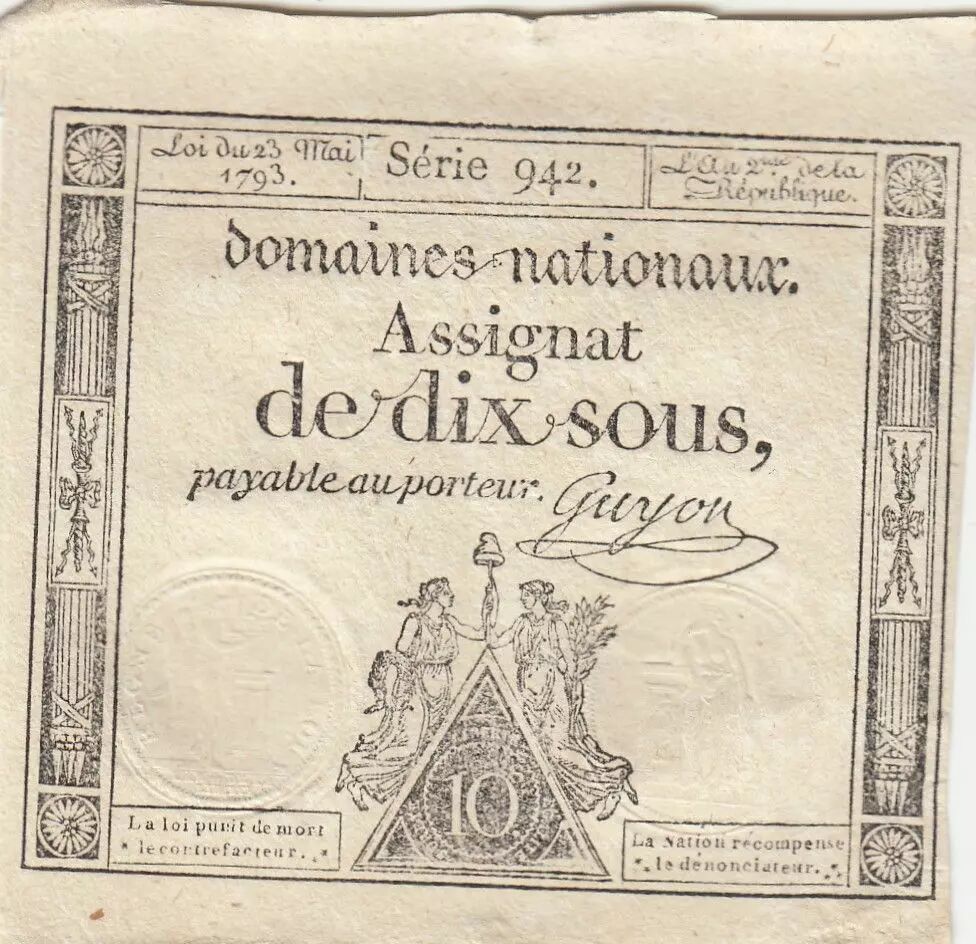 Home > French Banknotes > Assignats > 10 Sols > France 10 Sous - Women with Liberty cap on pole - 23-05-1793 - Sign. Guyon - Série 942