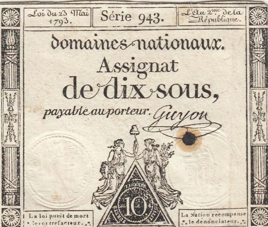 Banknote France 10 Sous - Women with Liberty cap on pole - 23-05-1793 - Sign. Guyon - Série 943