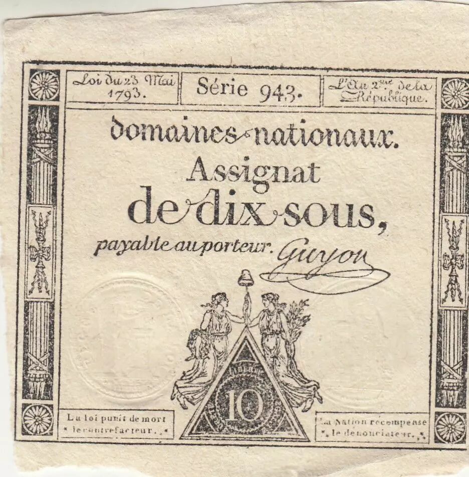 Home > French Banknotes > Assignats > 10 Sols > France 10 Sous - Women with Liberty cap on pole - 23-05-1793 - Sign. Guyon - Série 943