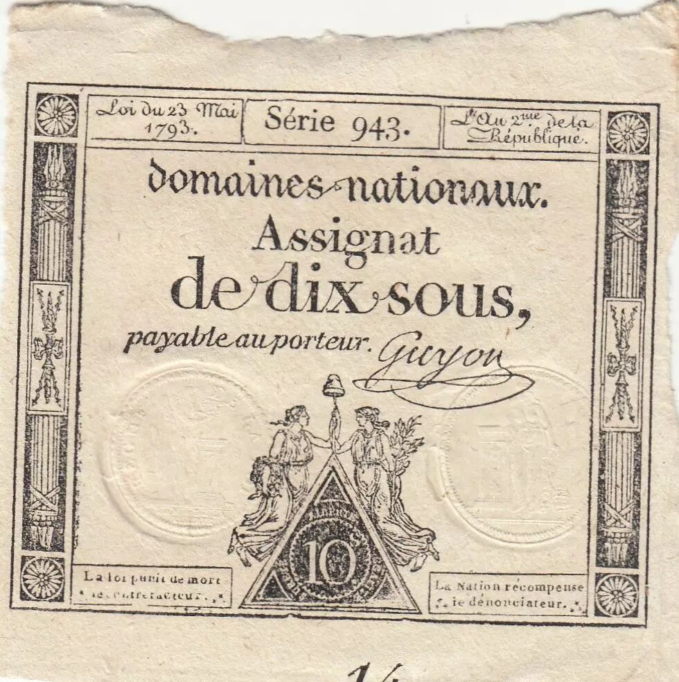 Banknote France 10 Sous - Women with Liberty cap on pole - 23-05-1793 - Sign. Guyon - Série 943 - Numéro 14