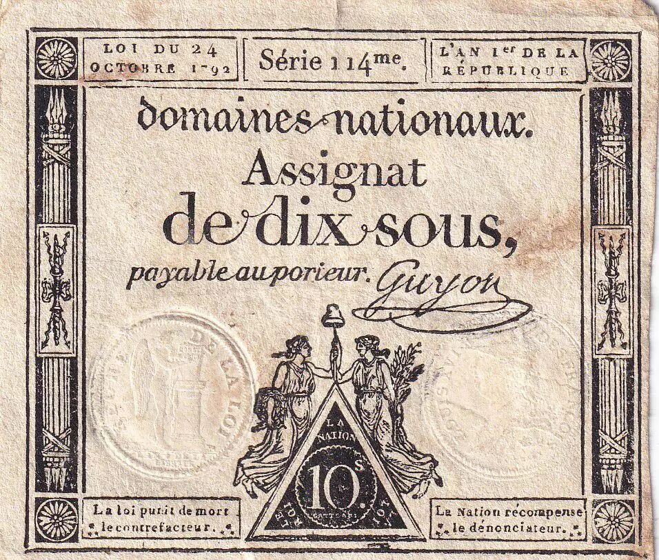Banknote France 10 Sous - Women with Liberty cap on pole (24-10-1792) - Sign. Guyon - Serial 114 - P.64
