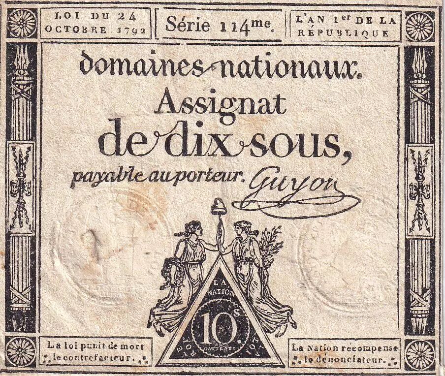 Banknote France 10 Sous - Women with Liberty cap on pole (24-10-1792) - Sign. Guyon - Serial 114 - P.64
