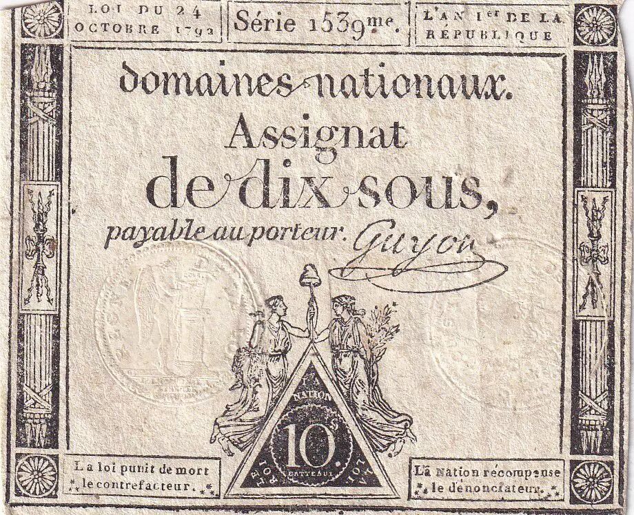Banknote France 10 Sous - Women with Liberty cap on pole (24-10-1792) - Sign. Guyon - Serial 1539 - P.64