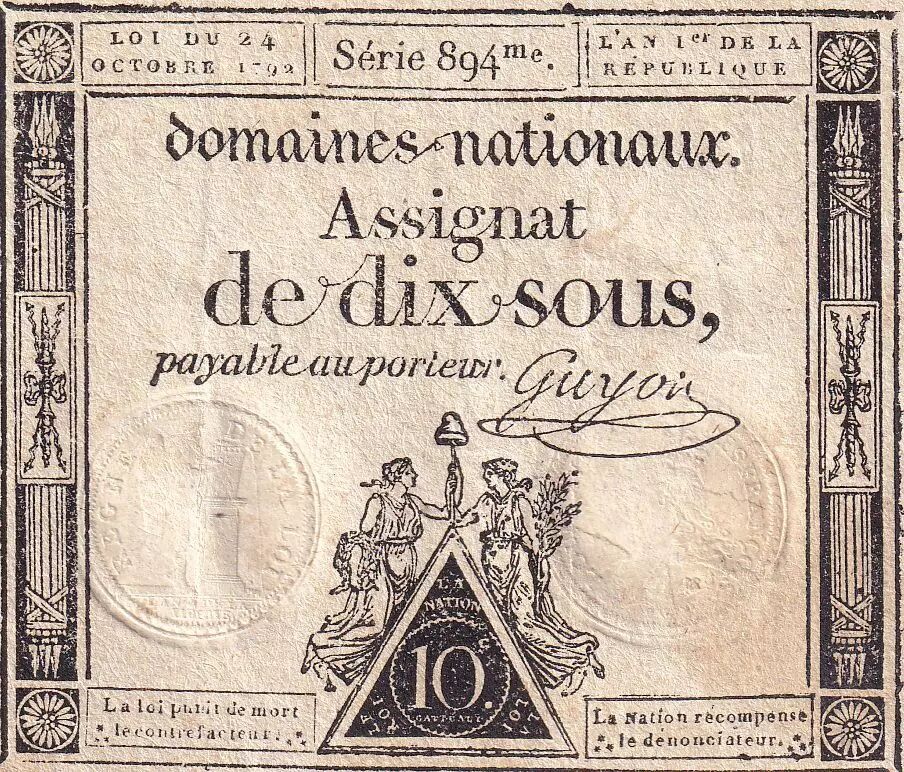 Banknote France 10 Sous - Women with Liberty cap on pole (24-10-1792) - Sign. Guyon - Serial 894 - P.64