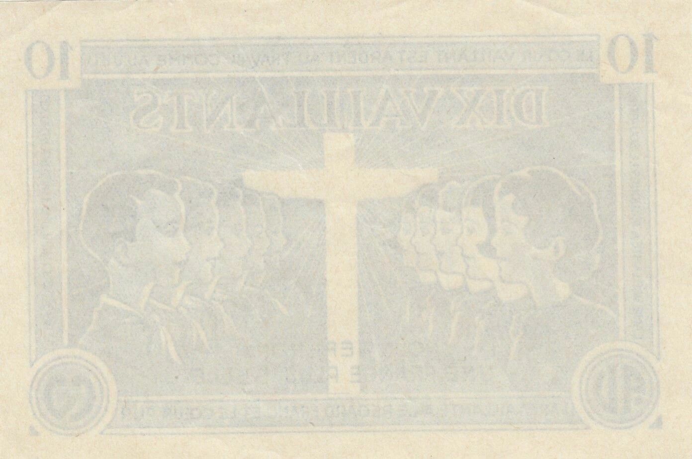 The note is designated as "10 Vaillants". The absence of a traditional issuing institution suggests that this note was produced and distributed directly by the Catholic Scouts, probably as part of their activities or events. It could have served as an internal means of exchange during camps, gatherings, or for specific transactions within the Scout community.