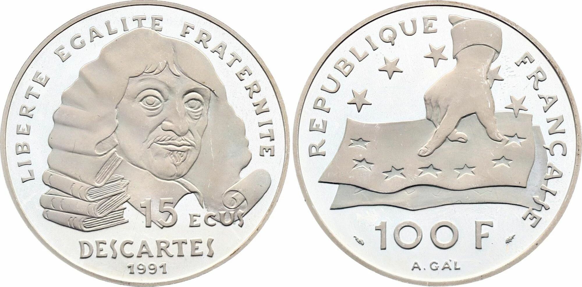 This collectible coin is a French issue from 1991, with a face value of 100 francs, equivalent to 15 ecus. It is struck in silver.