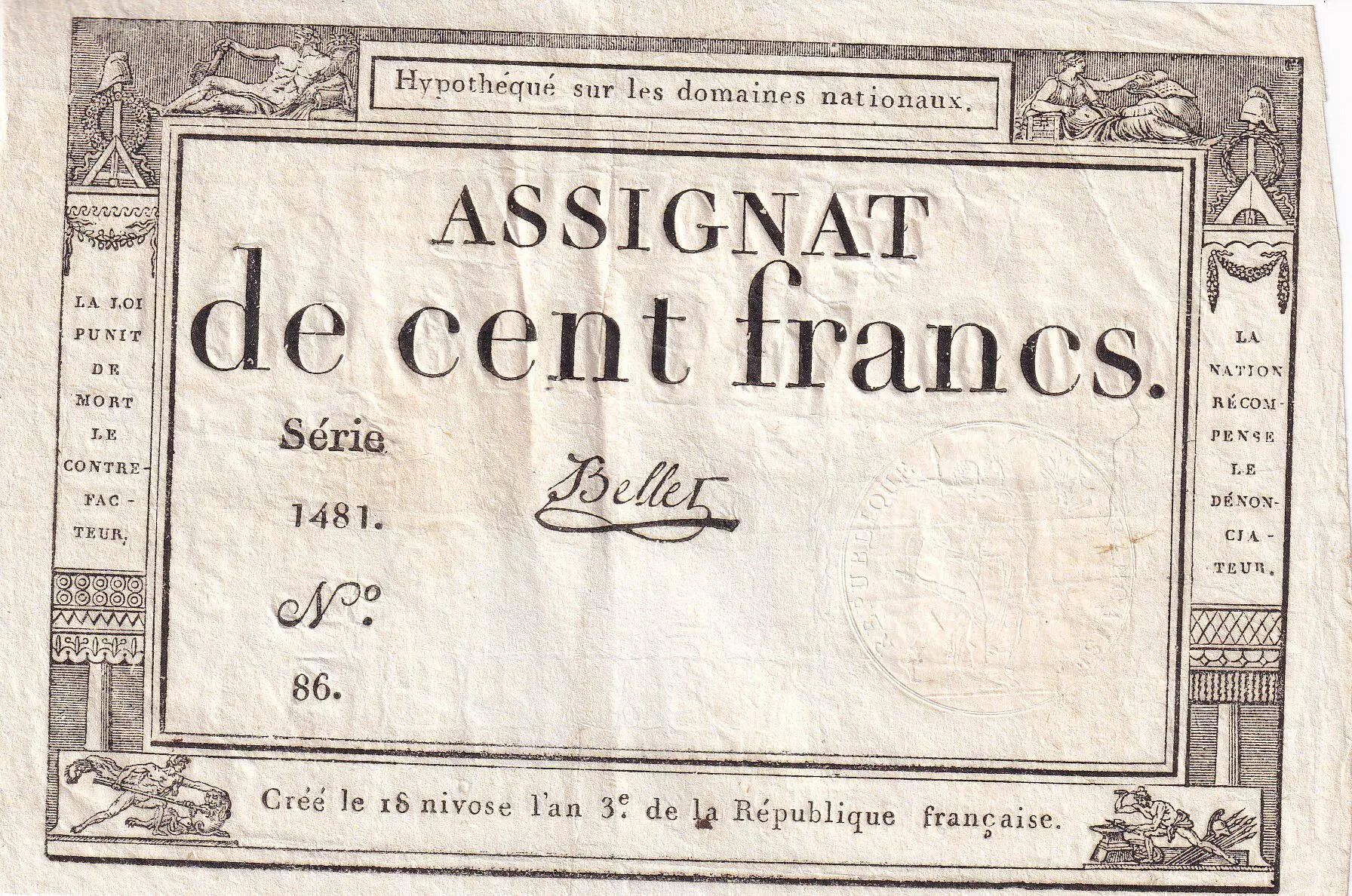 Billet France 100 Francs - 18 Nivose An III - (07.01.1795) - Sign. Bellet - Série 1481 - L.173