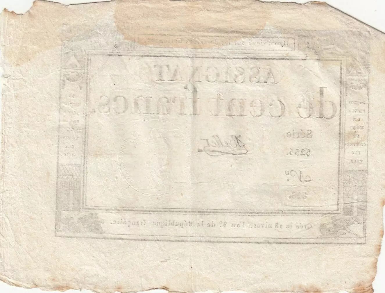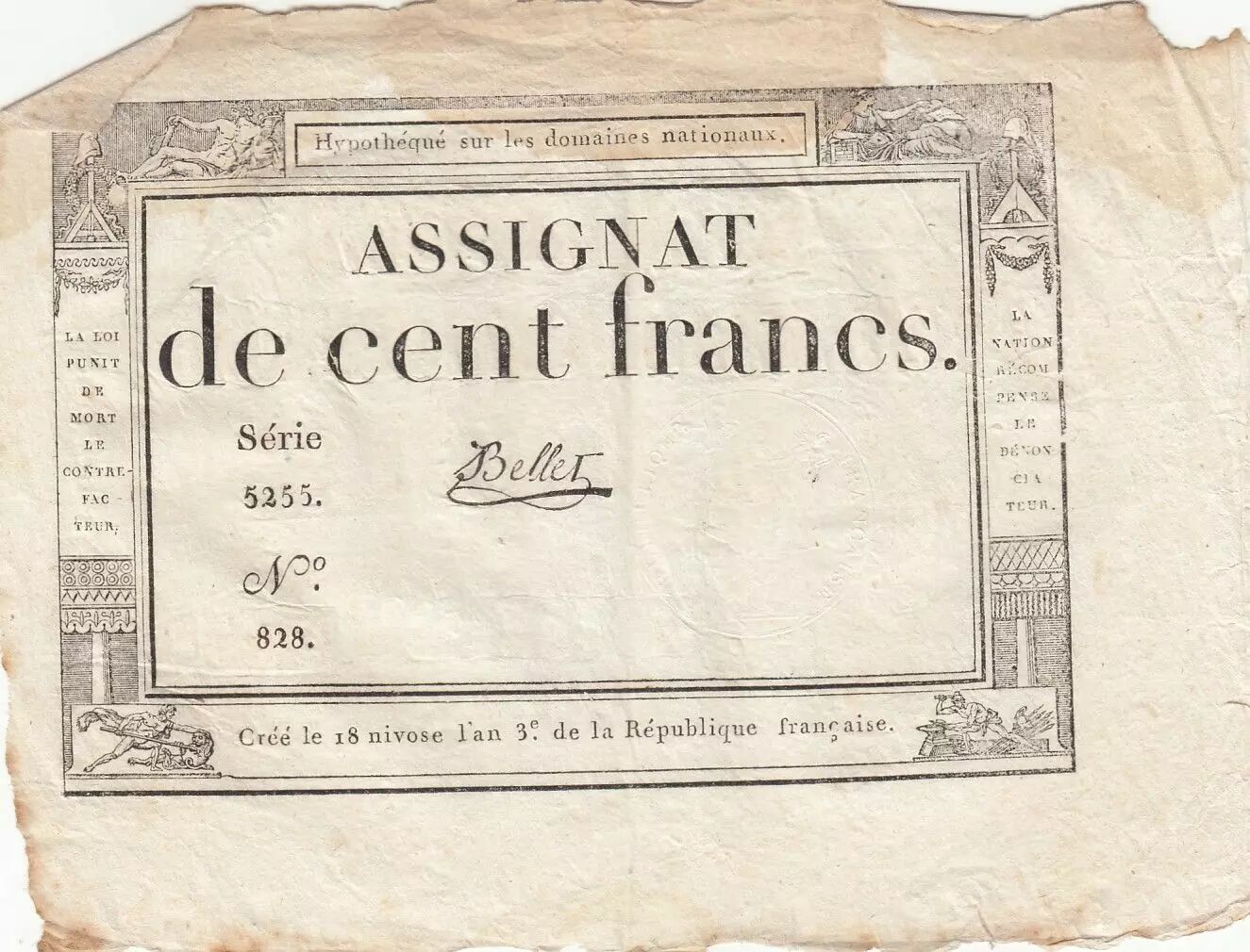 Billet France 100 Francs - 18 Nivose An III - (07.01.1795) - Sign. Bellet - Série 5255