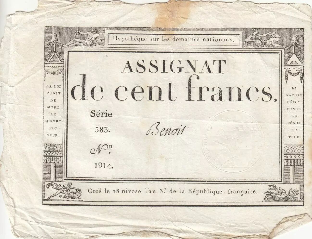 Billet France 100 Francs - 18 Nivose An III - (07.01.1795) - Sign. Benoit - Série 583