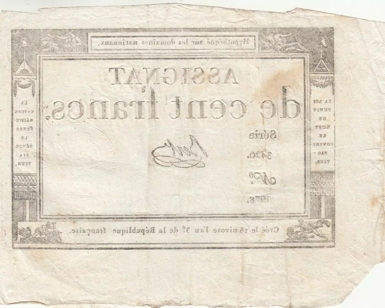 Banknote France 100 Francs - 18 Nivose An III - (07.01.1795) - Sign. Bert - Serial 3420
