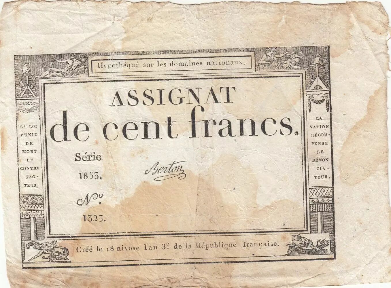 Accueil > Billets Français > Assignats > 100 Francs > France 100 Francs - 18 Nivose An III - (07.01.1795) - Sign. Berton - Série 1853