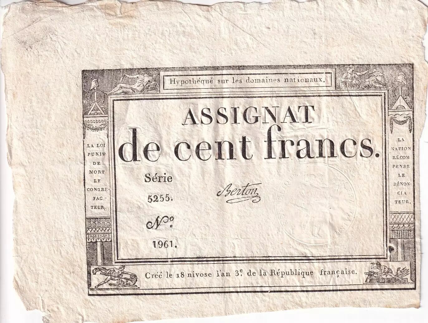 Accueil > Archivage > France 100 Francs - 18 Nivose An III - (07.01.1795) - Sign. Berton - Série 5255