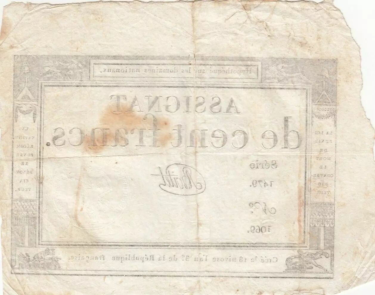Home > French Banknotes > Assignats > 100 Francs > France 100 Francs - 18 Nivose An III - (07.01.1795) - Sign. Boitet - Serial 1479