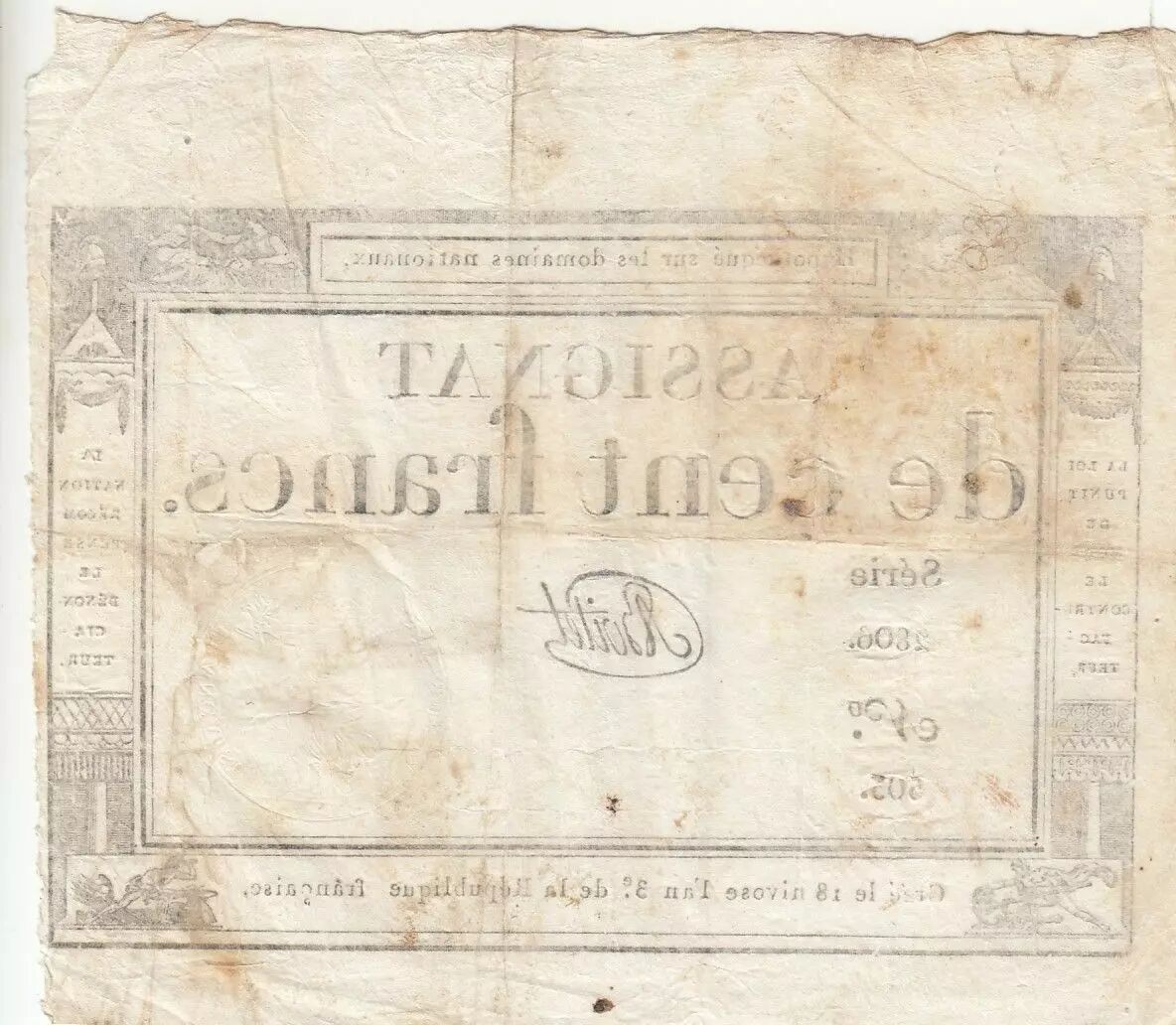 Accueil > Billets Français > Assignats > 100 Francs > France 100 Francs - 18 Nivose An III - (07.01.1795) - Sign. Boitet - Série 2806