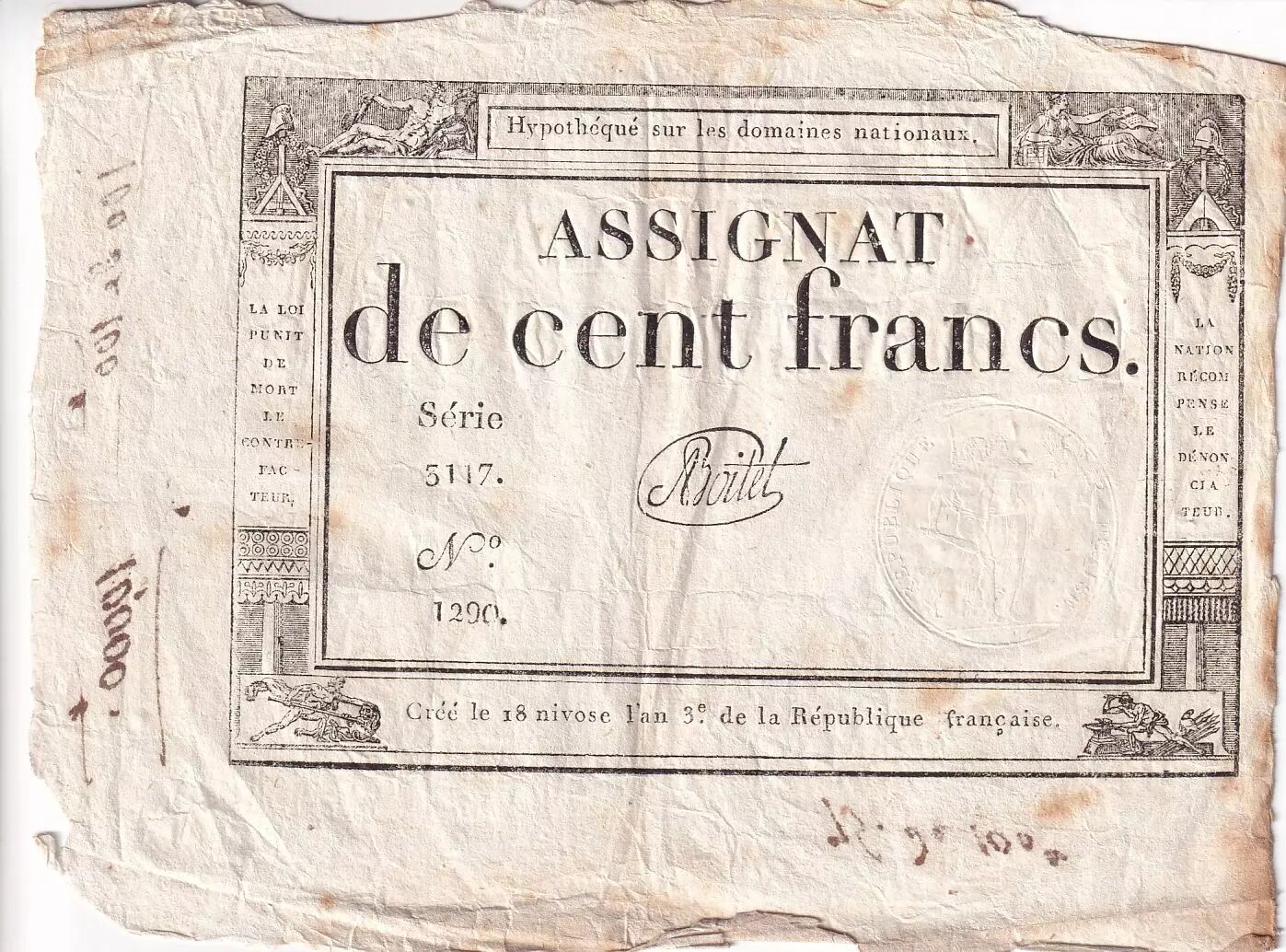 Accueil > Archivage > France 100 Francs - 18 Nivose An III - (07.01.1795) - Sign. Boitet - Série 5117