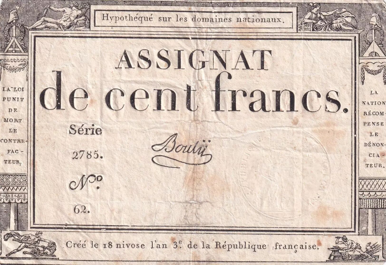 Home > > France 100 Francs - 18 Nivose An III - (07.01.1795) - Sign. Bouty - Serial 2785