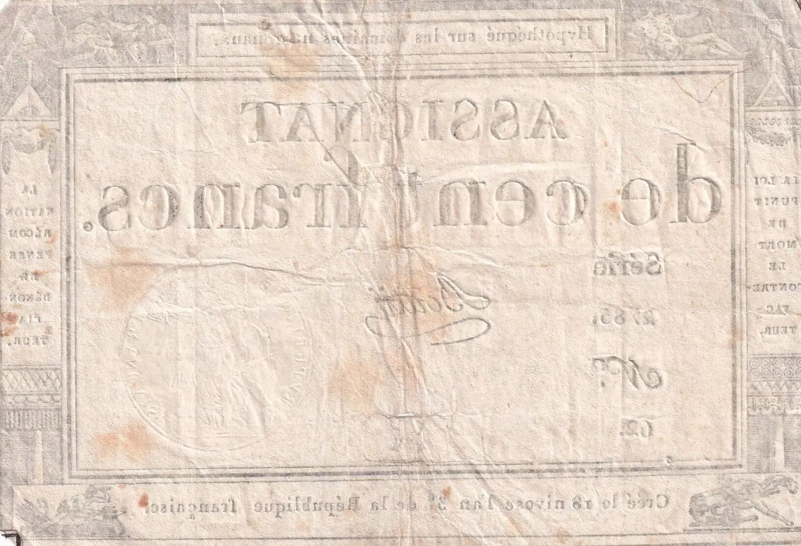 Banknote France 100 Francs - 18 Nivose An III - (07.01.1795) - Sign. Bouty - Serial 2785