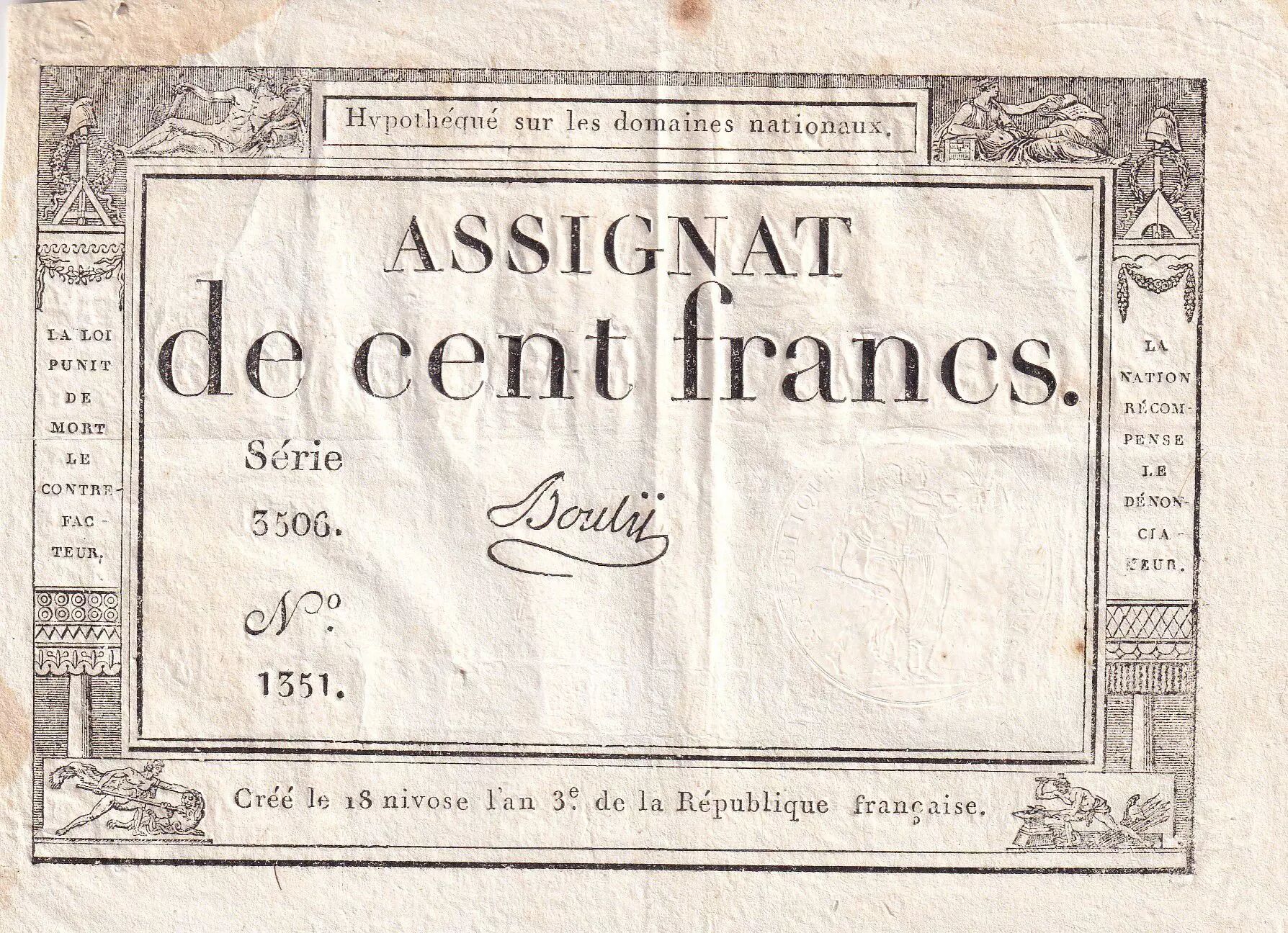 Home > > France 100 Francs - 18 Nivose An III - (07.01.1795) - Sign. Bouty - Serial 3506 - P.78