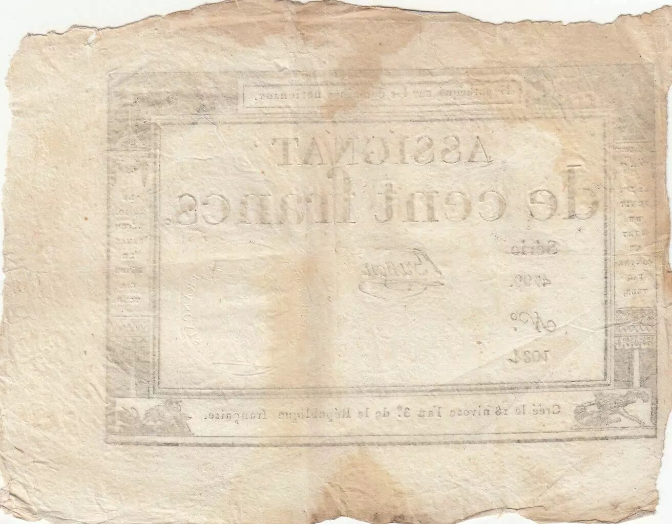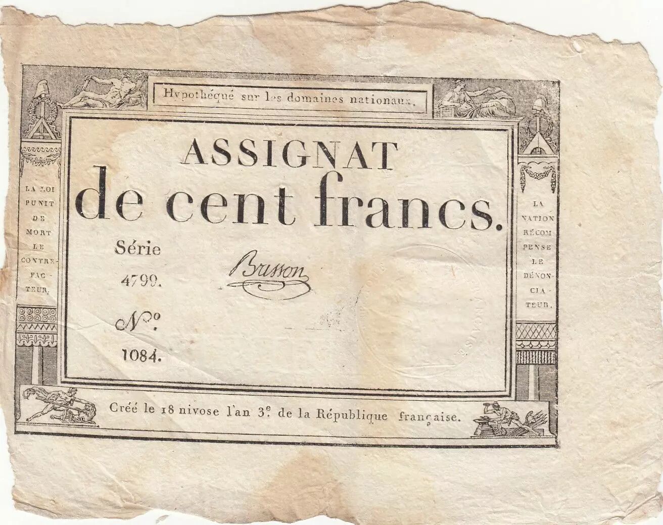 Banknote France 100 Francs - 18 Nivose An III - (07.01.1795) - Sign. Brisson - Serial 4799