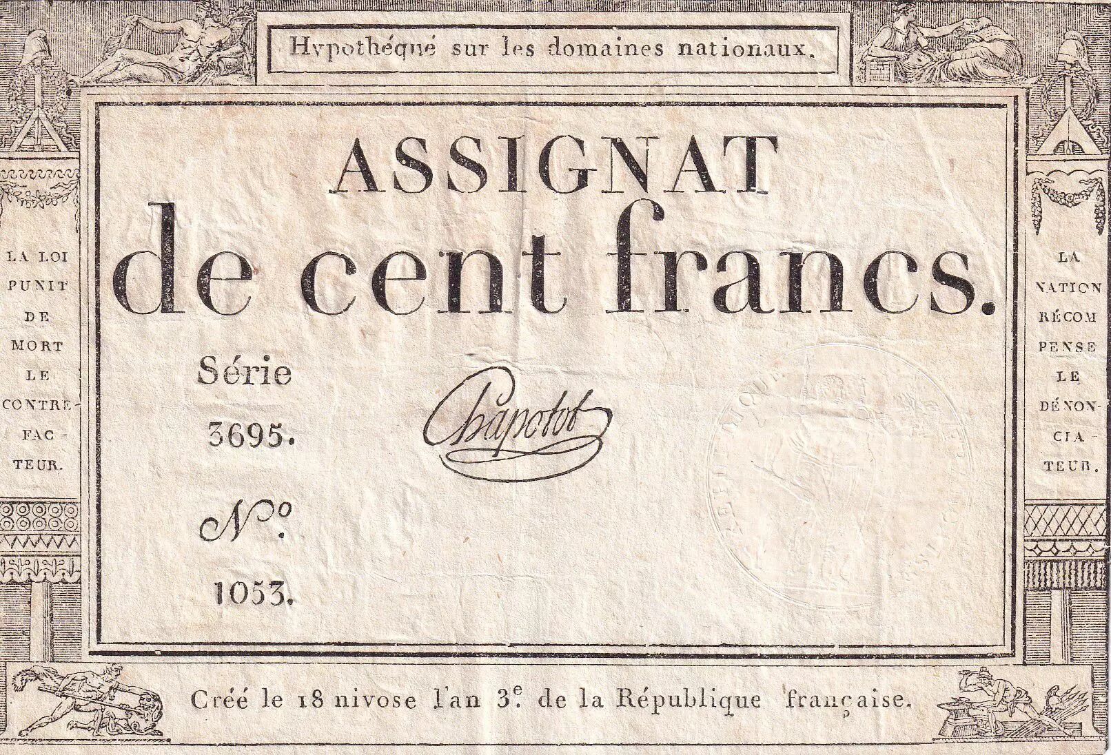 Banknote France 100 Francs - 18 Nivose An III - (07.01.1795) - Sign. Chapotot - P.78