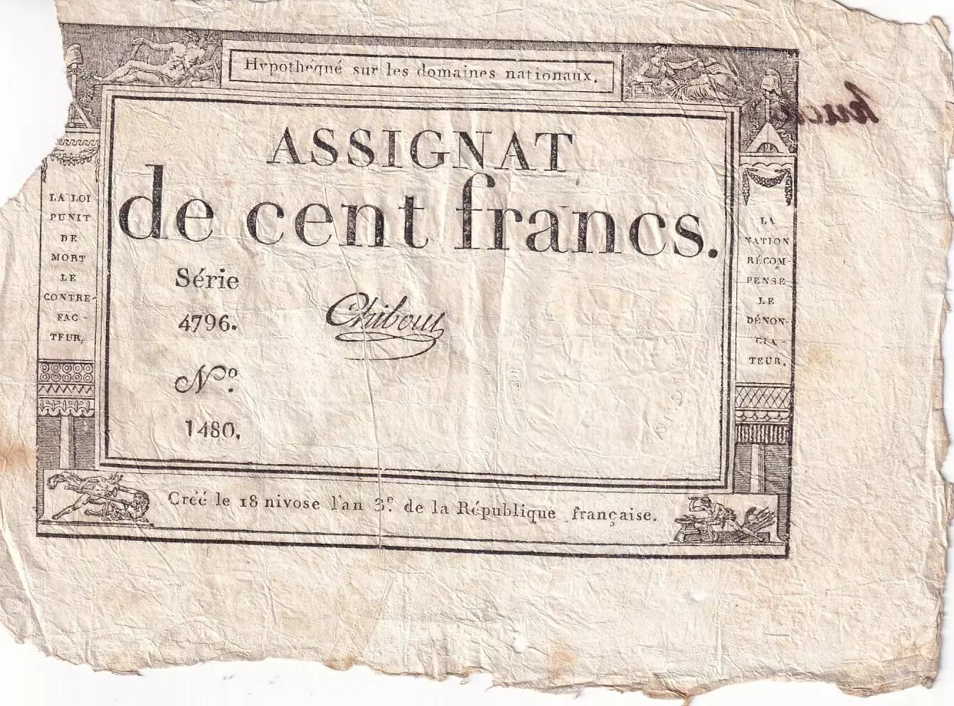 Banknote France 100 Francs - 18 Nivose An III - (07.01.1795) - Sign. Chibout - Serial 4796
