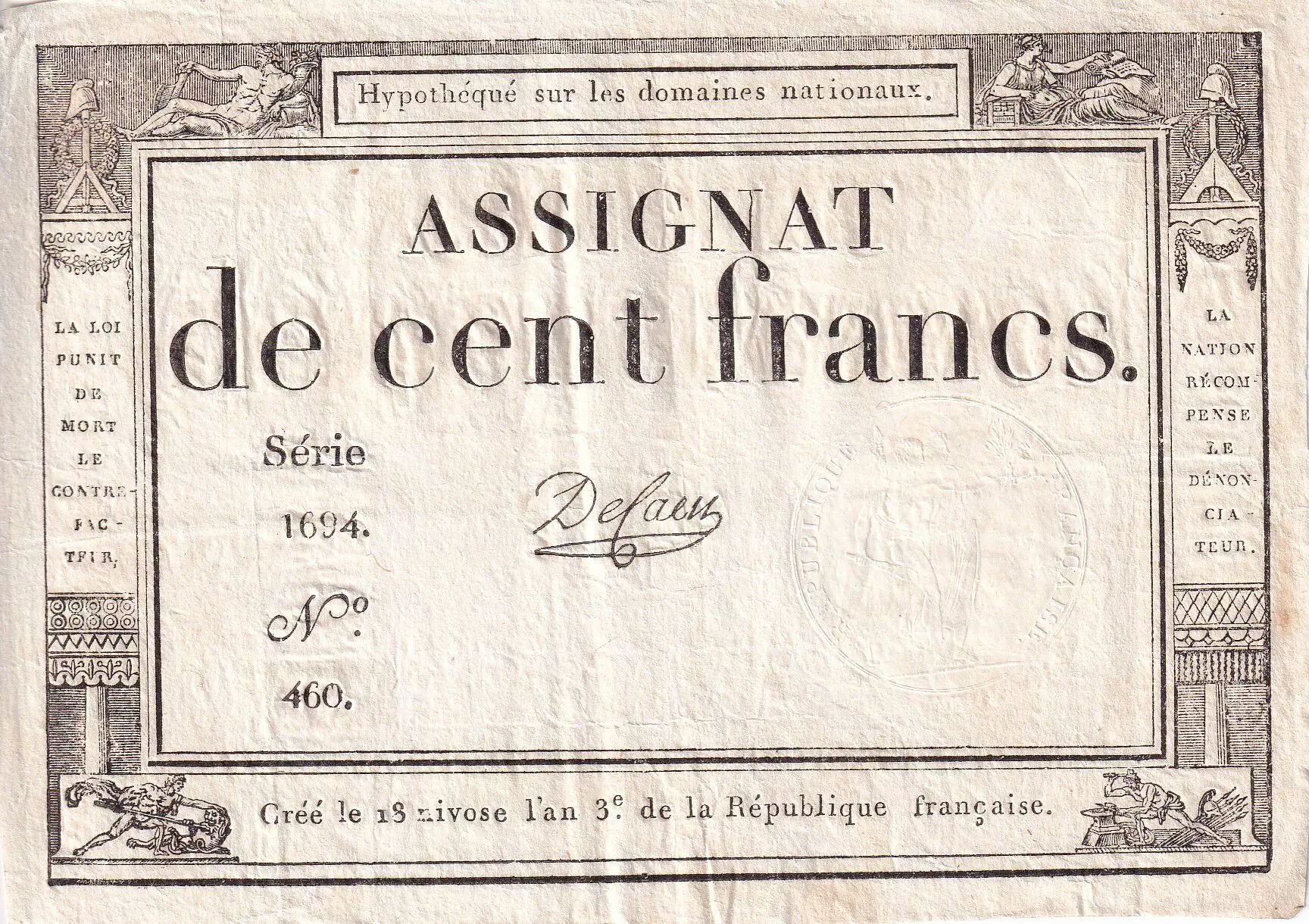Accueil > Archivage > France 100 Francs - 18 Nivose An III - (07.01.1795) - Sign. De Caen - L.173