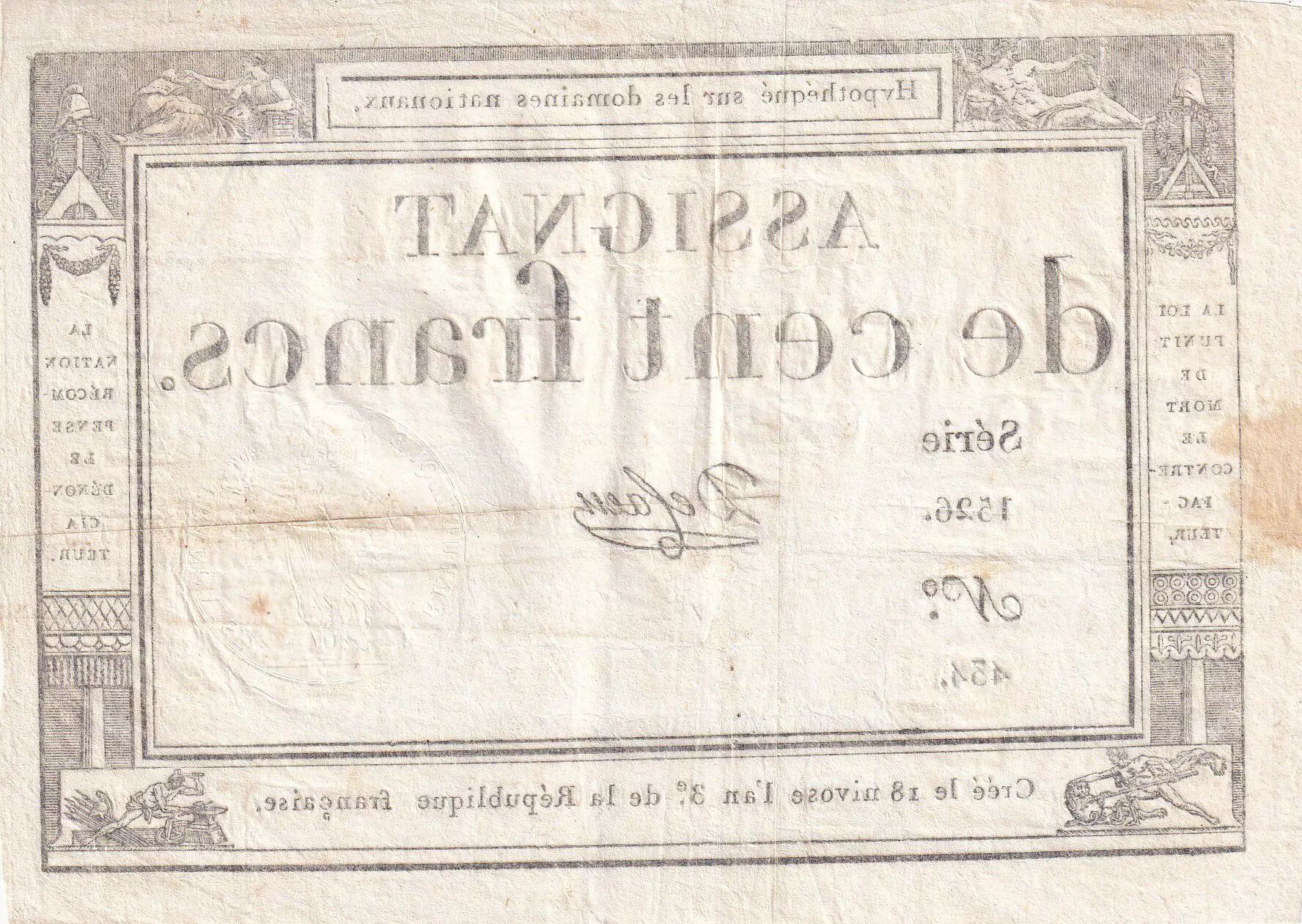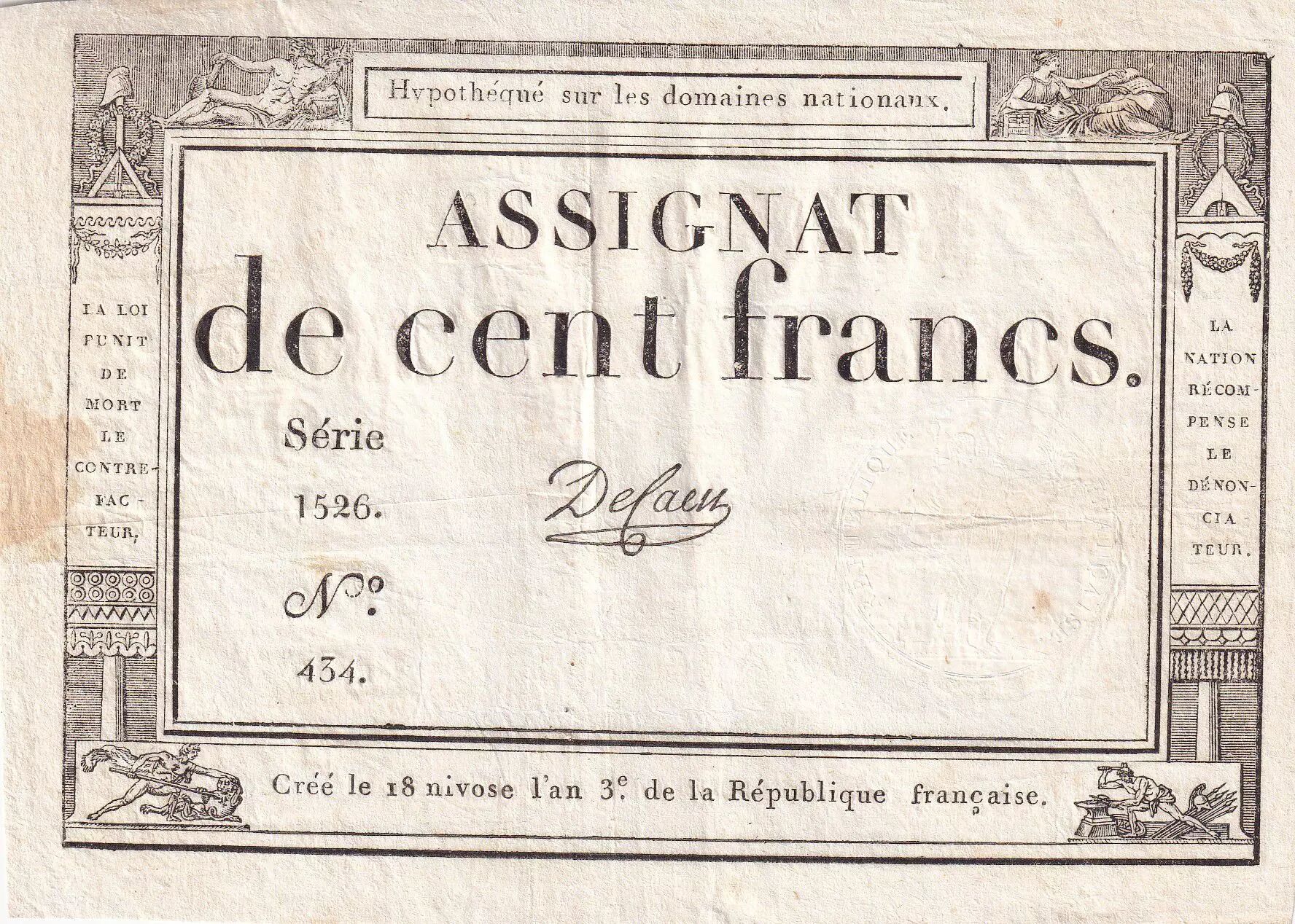 Banknote France 100 Francs - 18 Nivose An III - (07.01.1795) - Sign. De Caen - Serial 1526 - P.78
