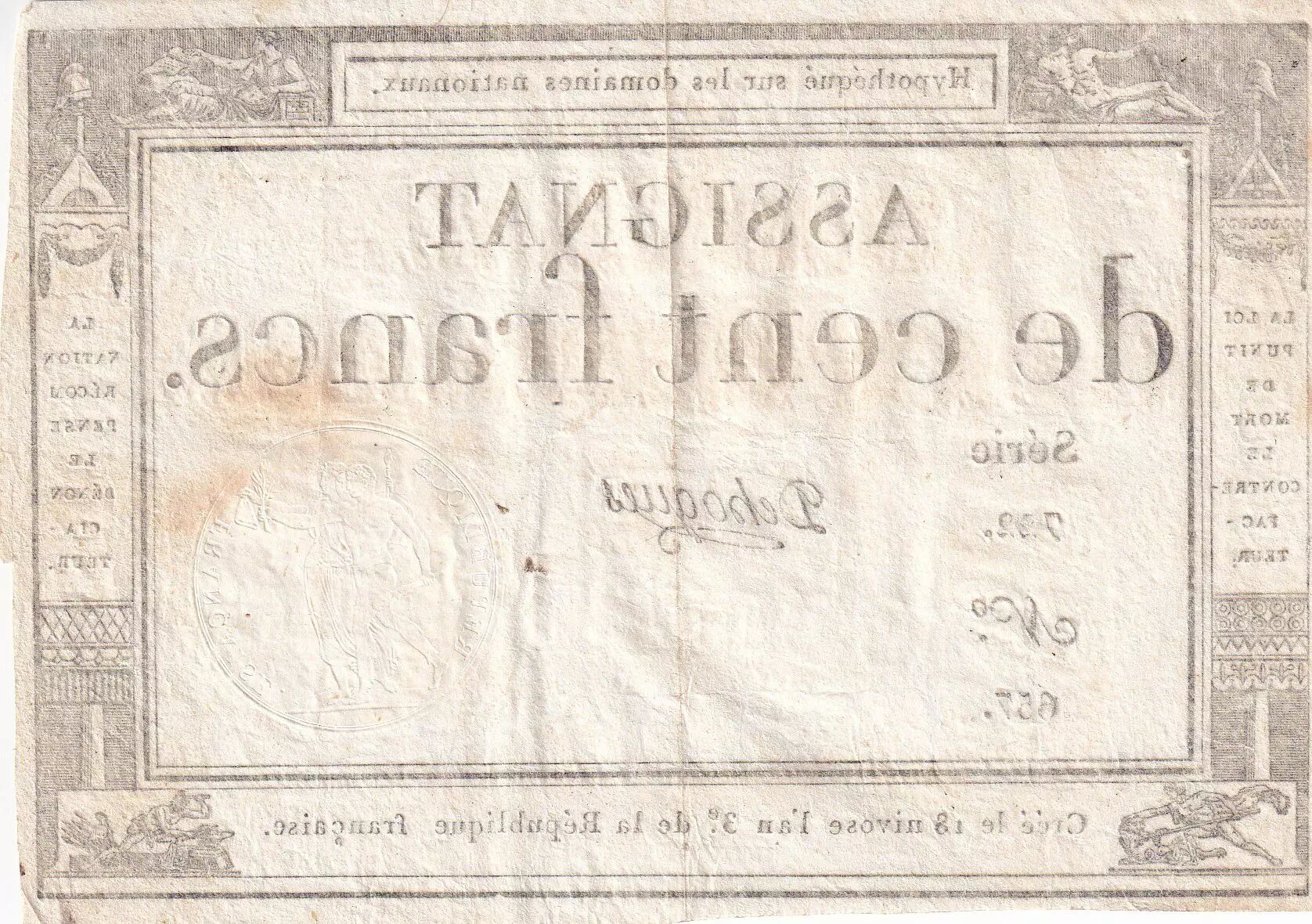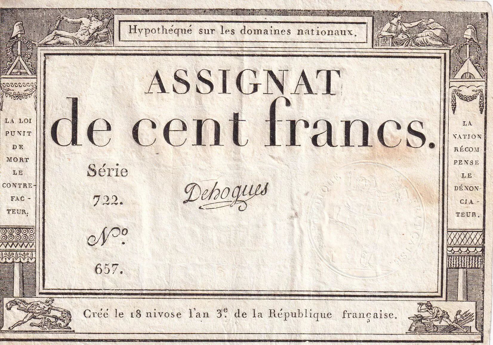 Accueil > Archivage > France 100 Francs - 18 Nivose An III - (07.01.1795) - Sign. De Hogues - L.173