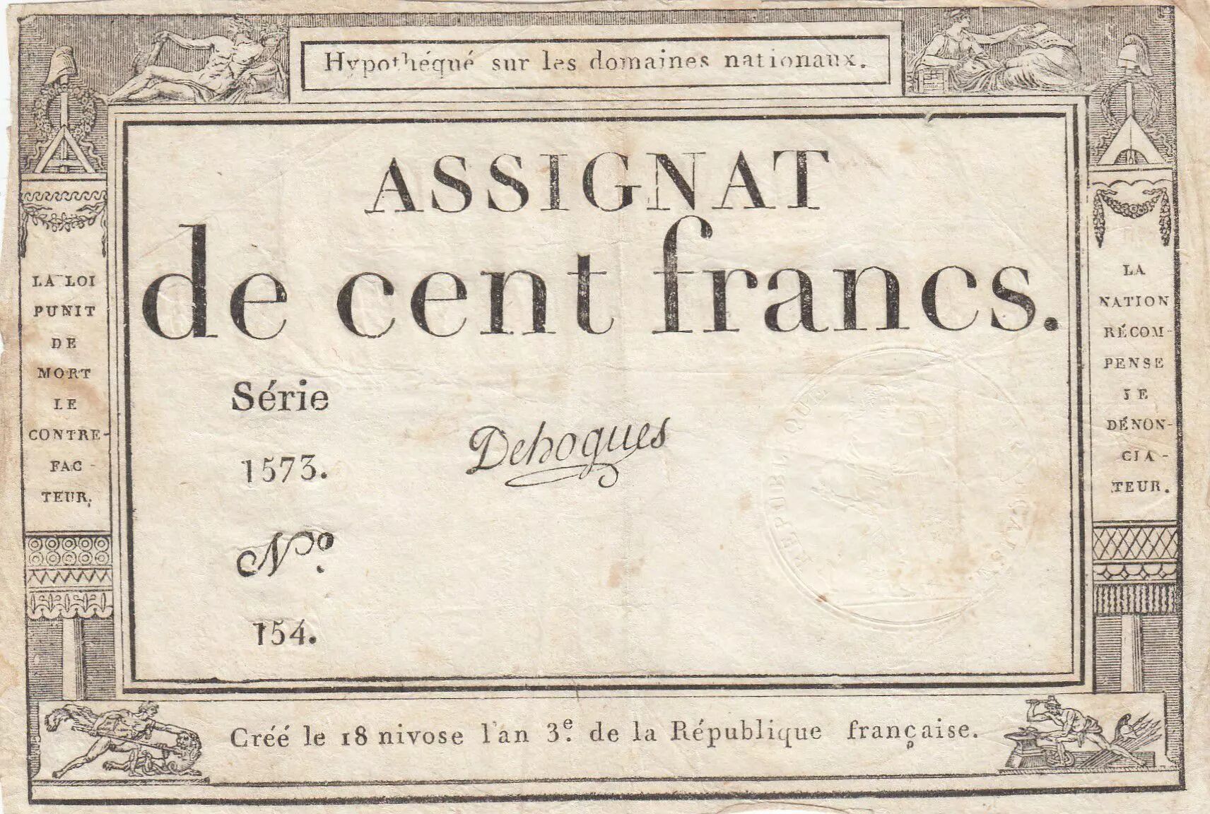 Billet France 100 Francs - 18 Nivose An III - (07.01.1795) - Sign. Dehogues - L.173 - Série 1573
