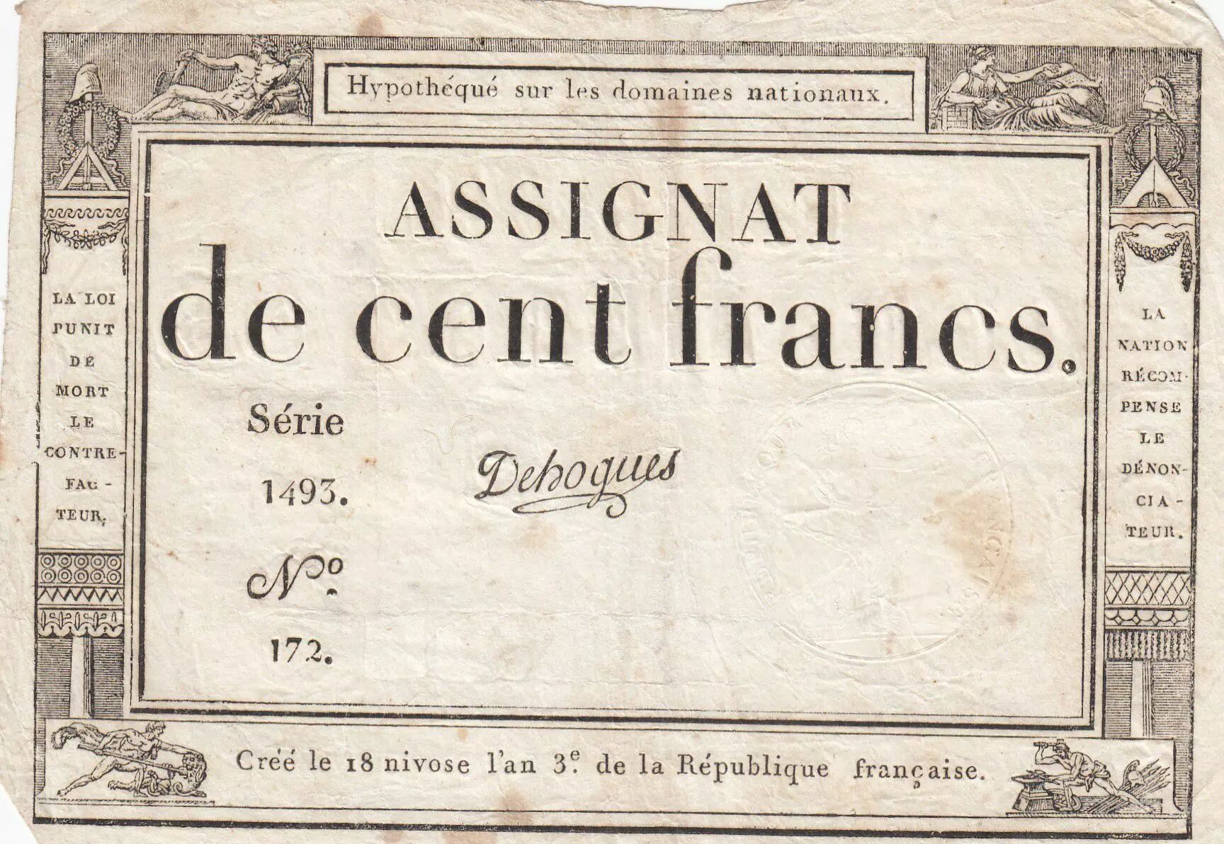 Home > > France 100 Francs - 18 Nivose An III - (07.01.1795) - Sign. Dehogues - P.78 - Serial 1493