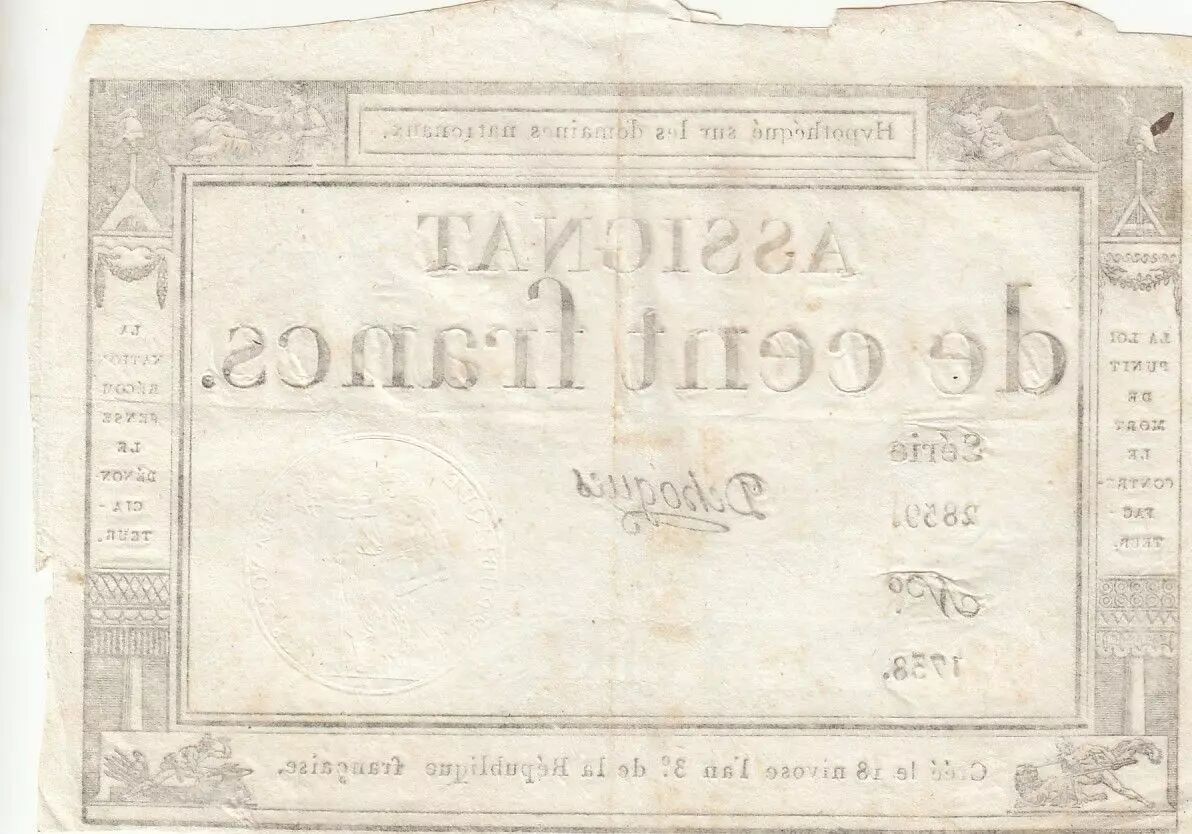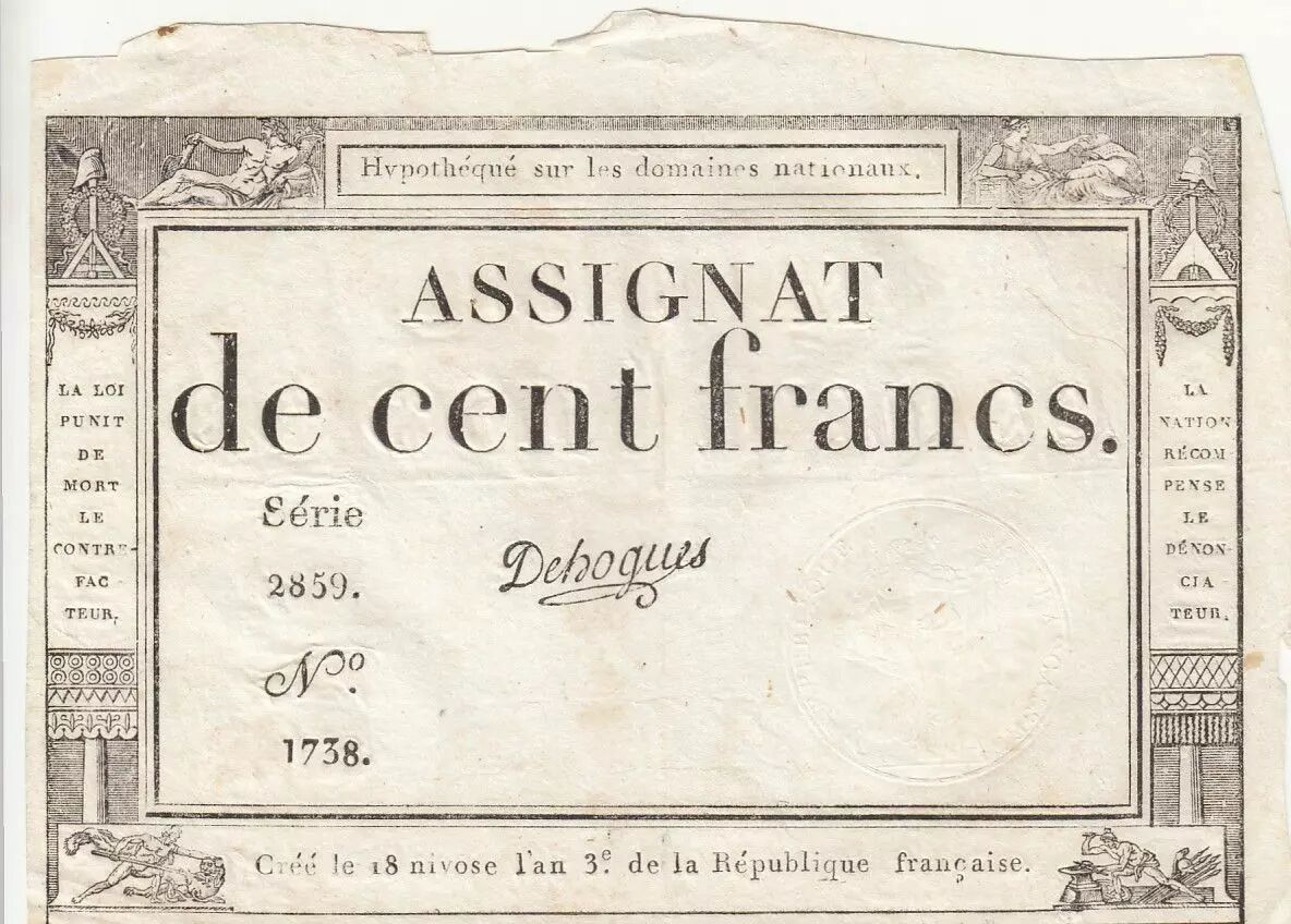 Banknote France 100 Francs - 18 Nivose An III - (07.01.1795) - Sign. Dehogues - Serial 2859