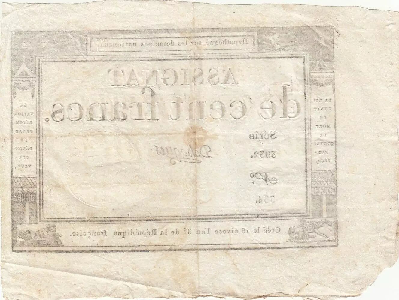 Banknote France 100 Francs - 18 Nivose An III - (07.01.1795) - Sign. Dehogues - Serial 3932