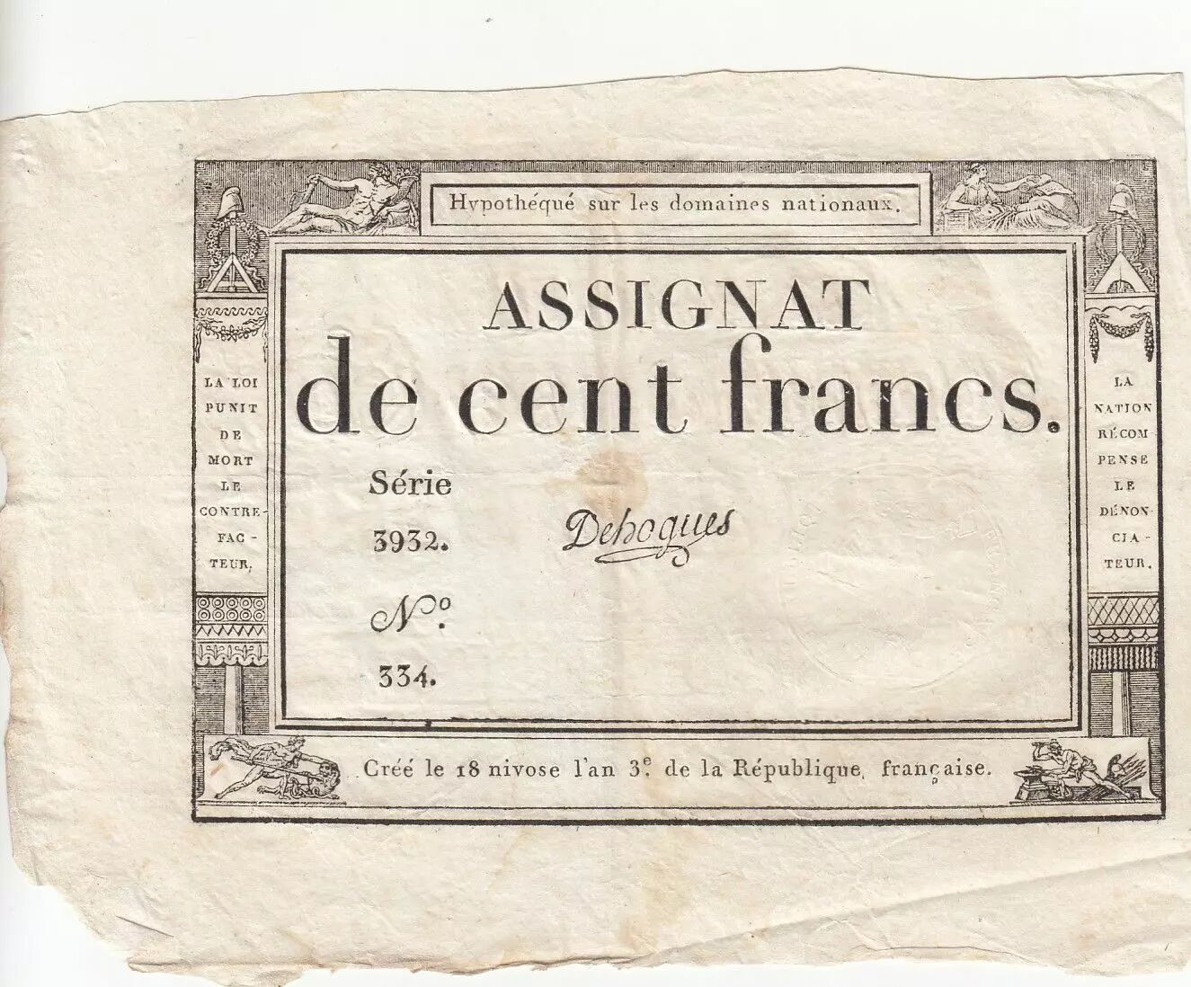 Billet France 100 Francs - 18 Nivose An III - (07.01.1795) - Sign. Dehogues - Série 3932