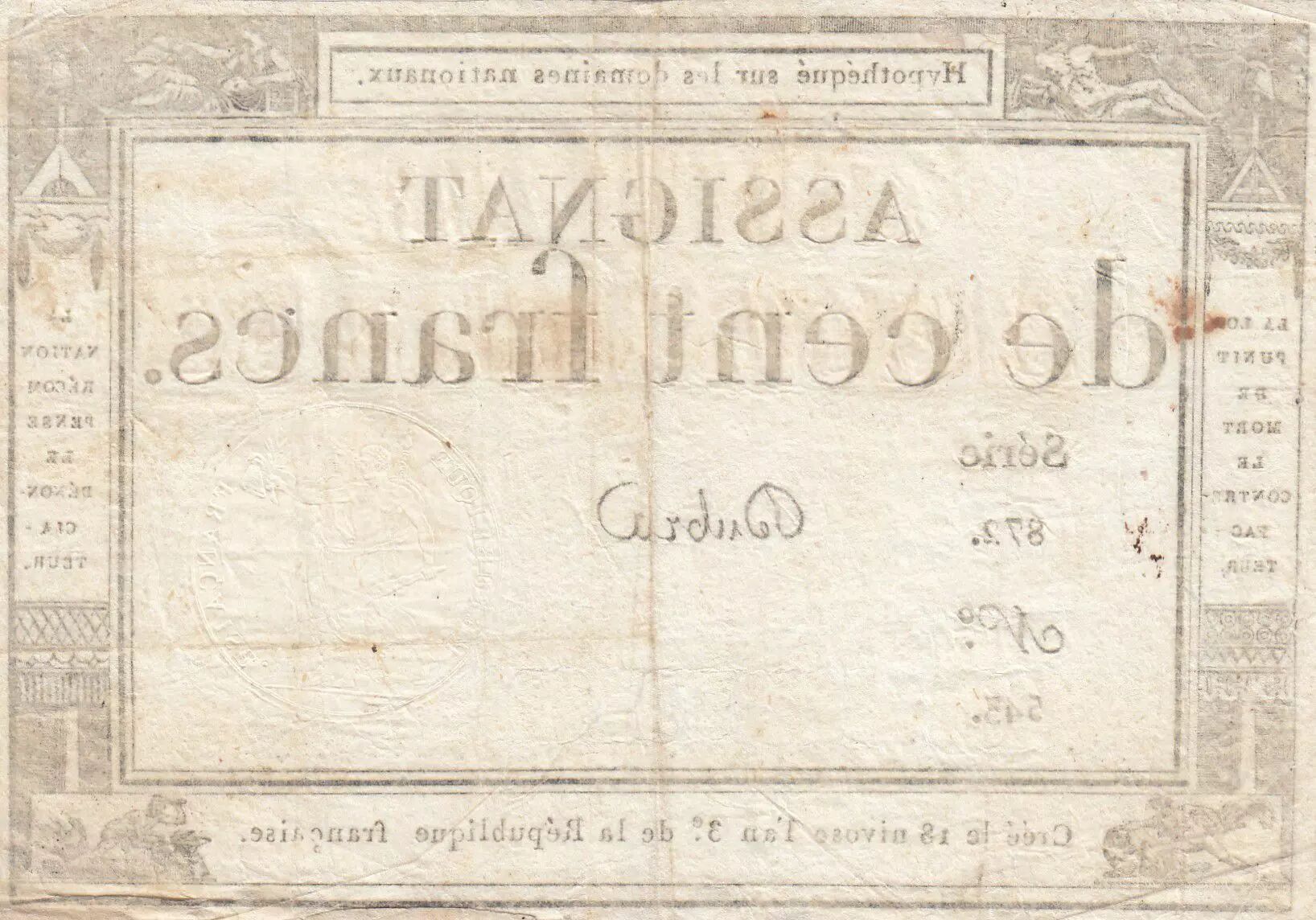 Accueil > Archivage > France 100 Francs - 18 Nivose An III - (07.01.1795) - Sign. Dubra- L.173 - Série 872