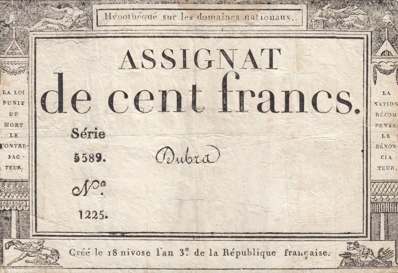 Home > > France 100 Francs - 18 Nivose An III - (07.01.1795) - Sign. Dubra - P.78 - Serial 5589