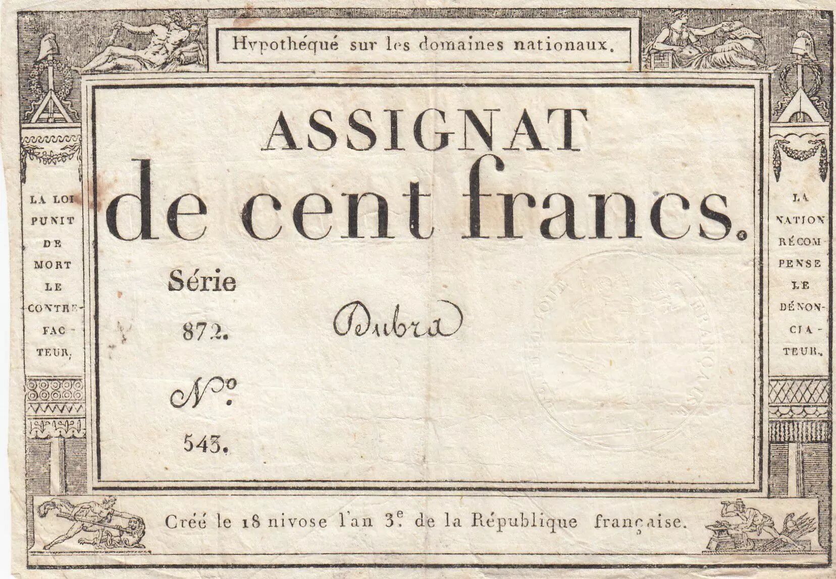 Home > > France 100 Francs - 18 Nivose An III - (07.01.1795) - Sign. Dubra - P.A.78 - Serial 872