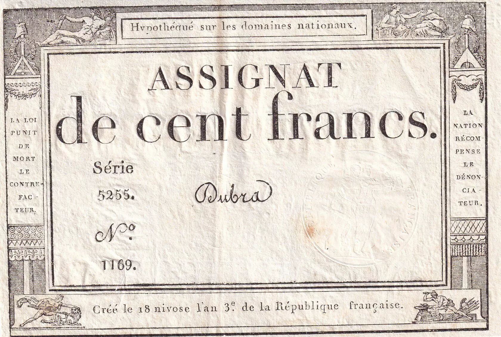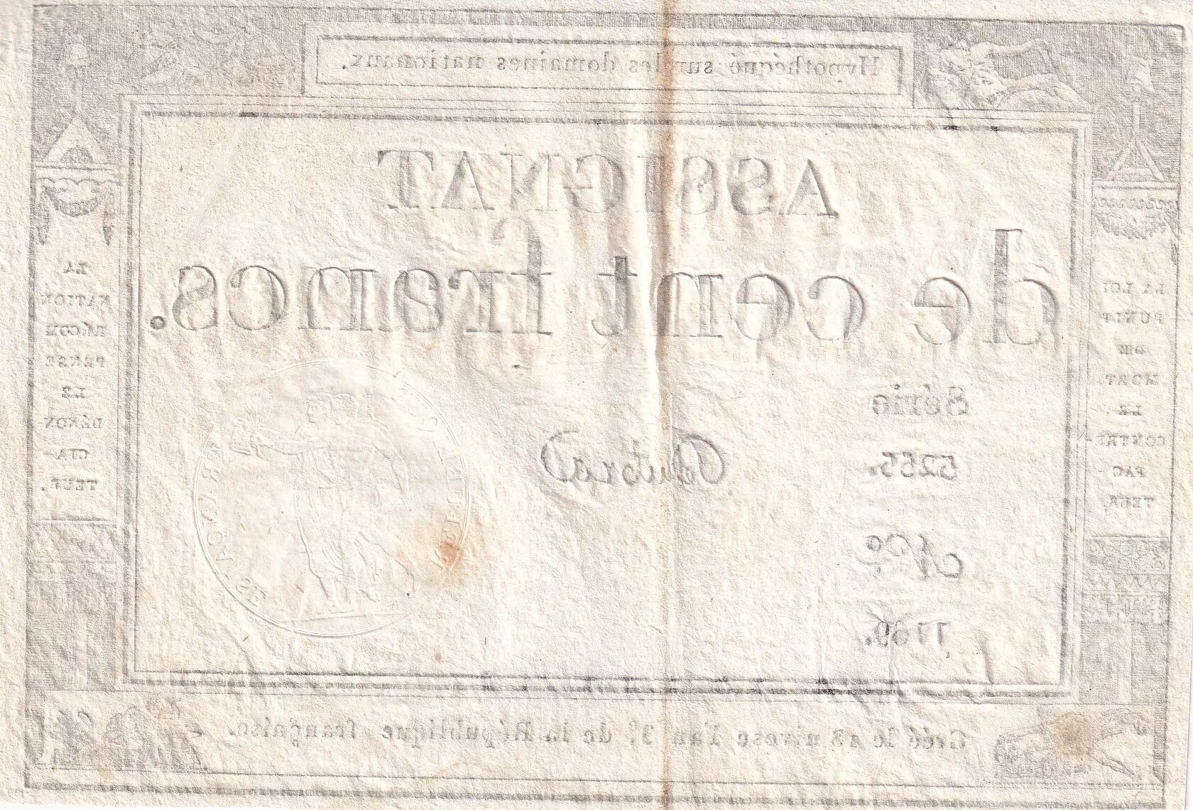 Banknote France 100 Francs - 18 Nivose An III - (07.01.1795) - Sign. Dubra - Serial 5255 - P.78