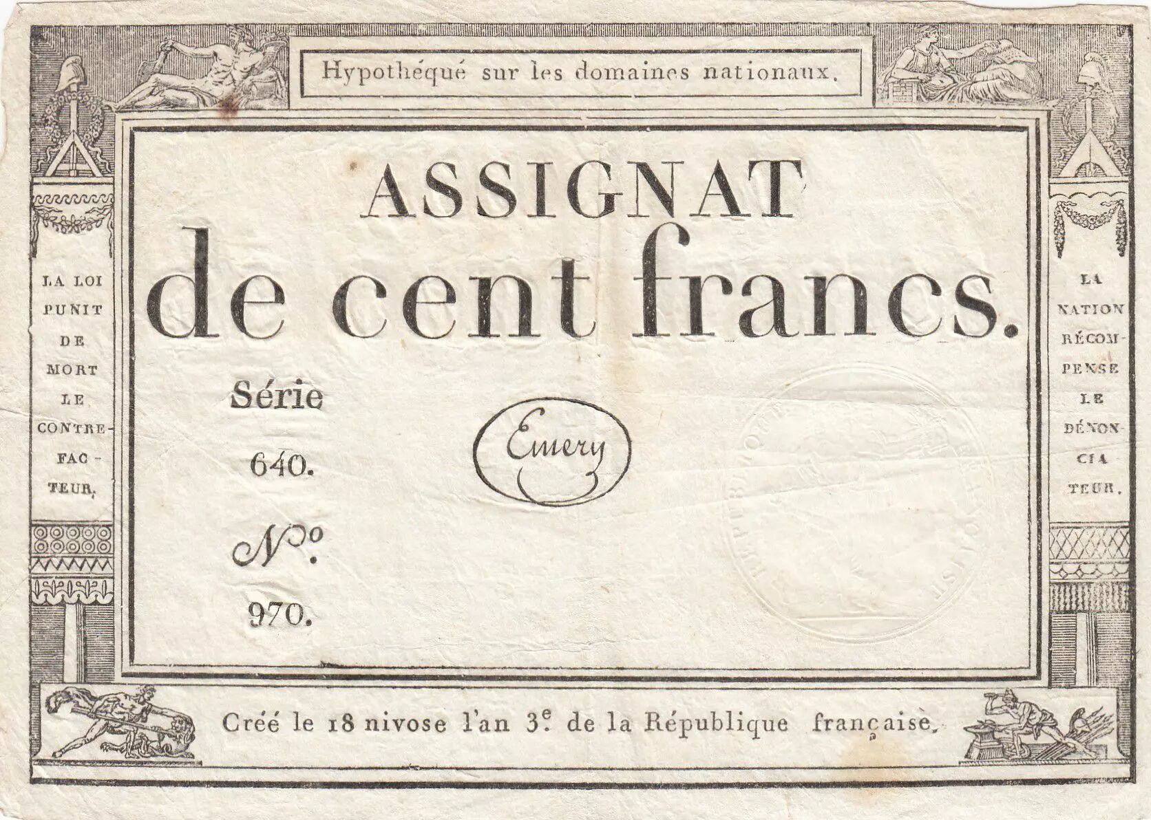 Banknote France 100 Francs - 18 Nivose An III - (07.01.1795) - Sign. Emery - P.A.78 - Serial 640