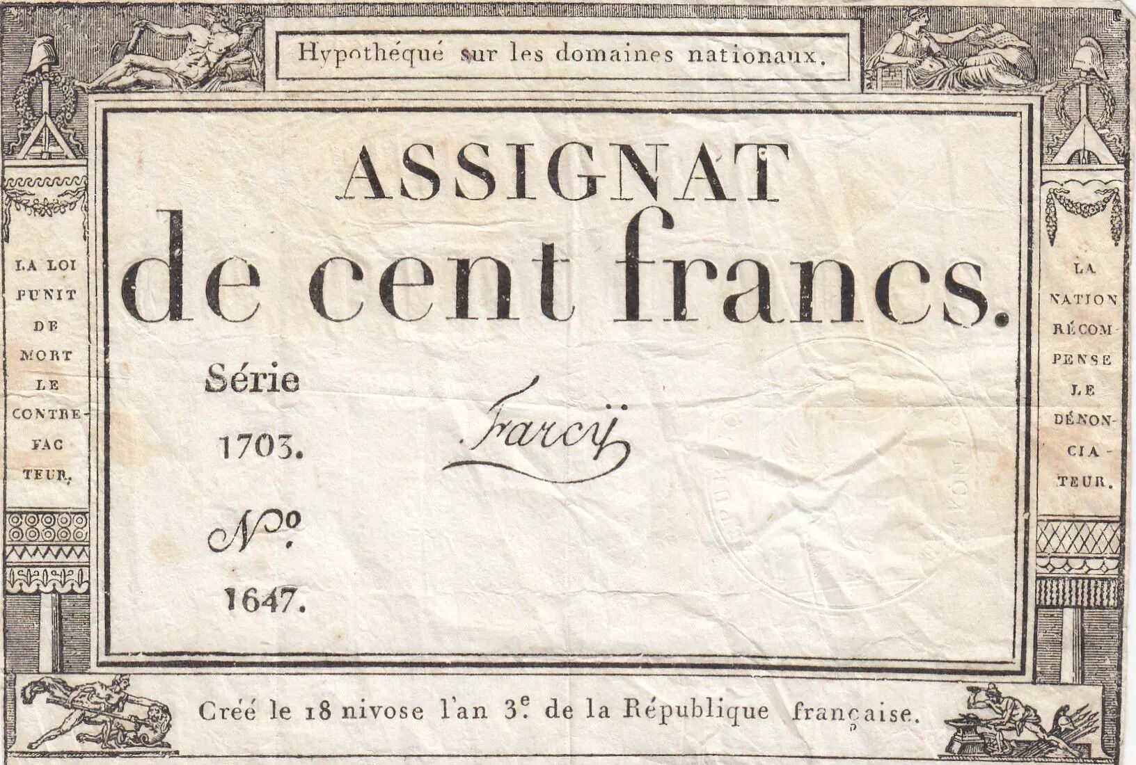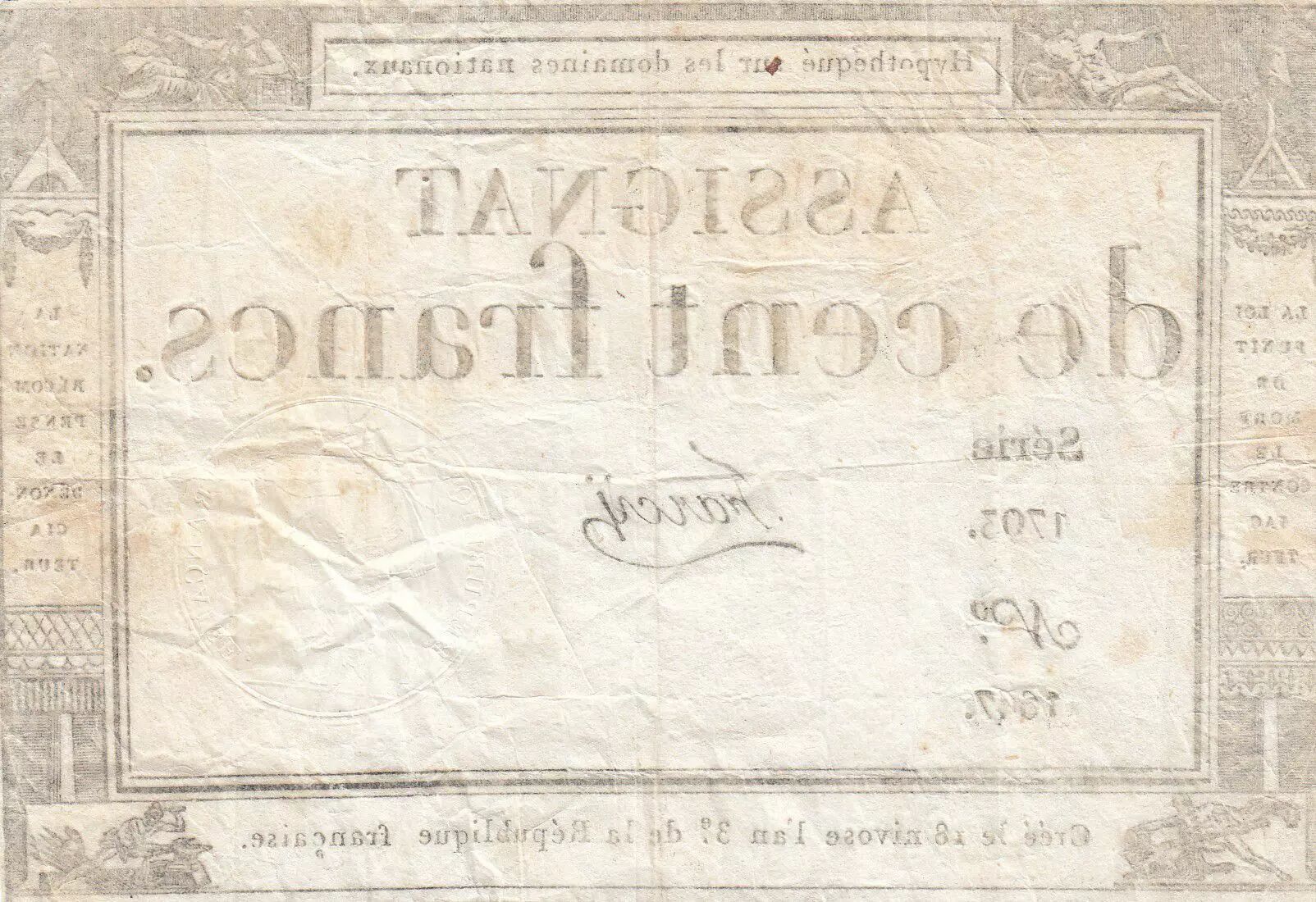 Banknote France 100 Francs - 18 Nivose An III - (07.01.1795) - Sign. Farcy - Serial 1703