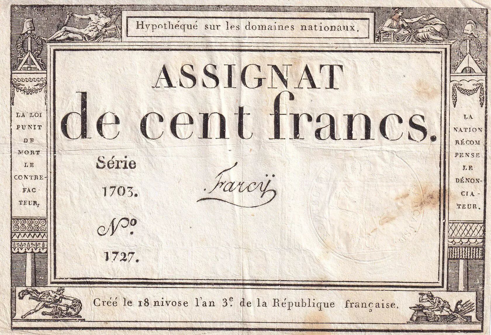 Banknote France 100 Francs - 18 Nivose An III - (07.01.1795) - Sign. Farcy - Serial 1730 - P.78