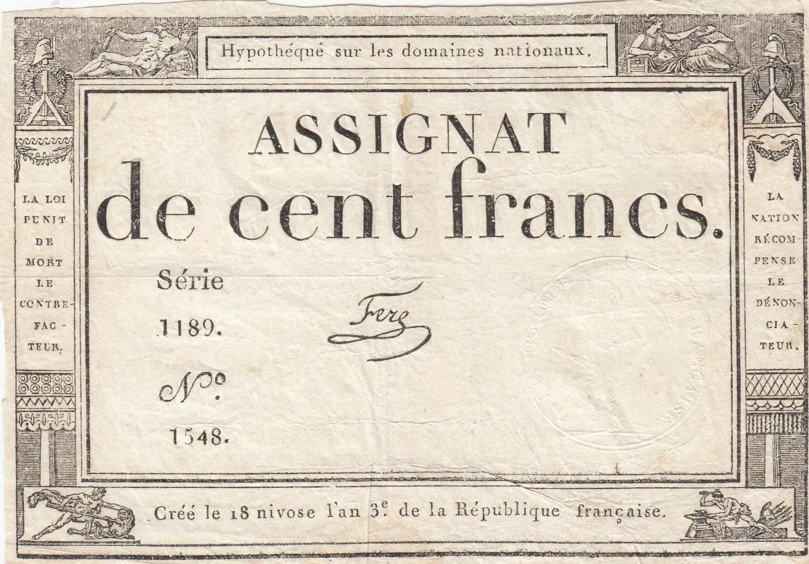Home > > France 100 Francs - 18 Nivose An III - (07.01.1795) - Sign. Feze - P.A.78 - Serial 1189