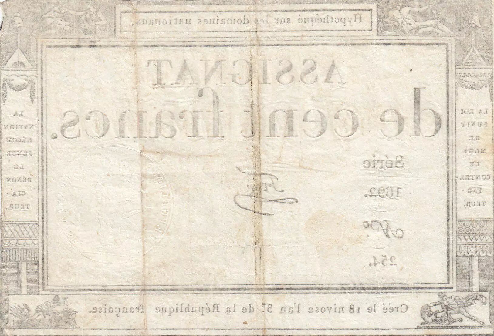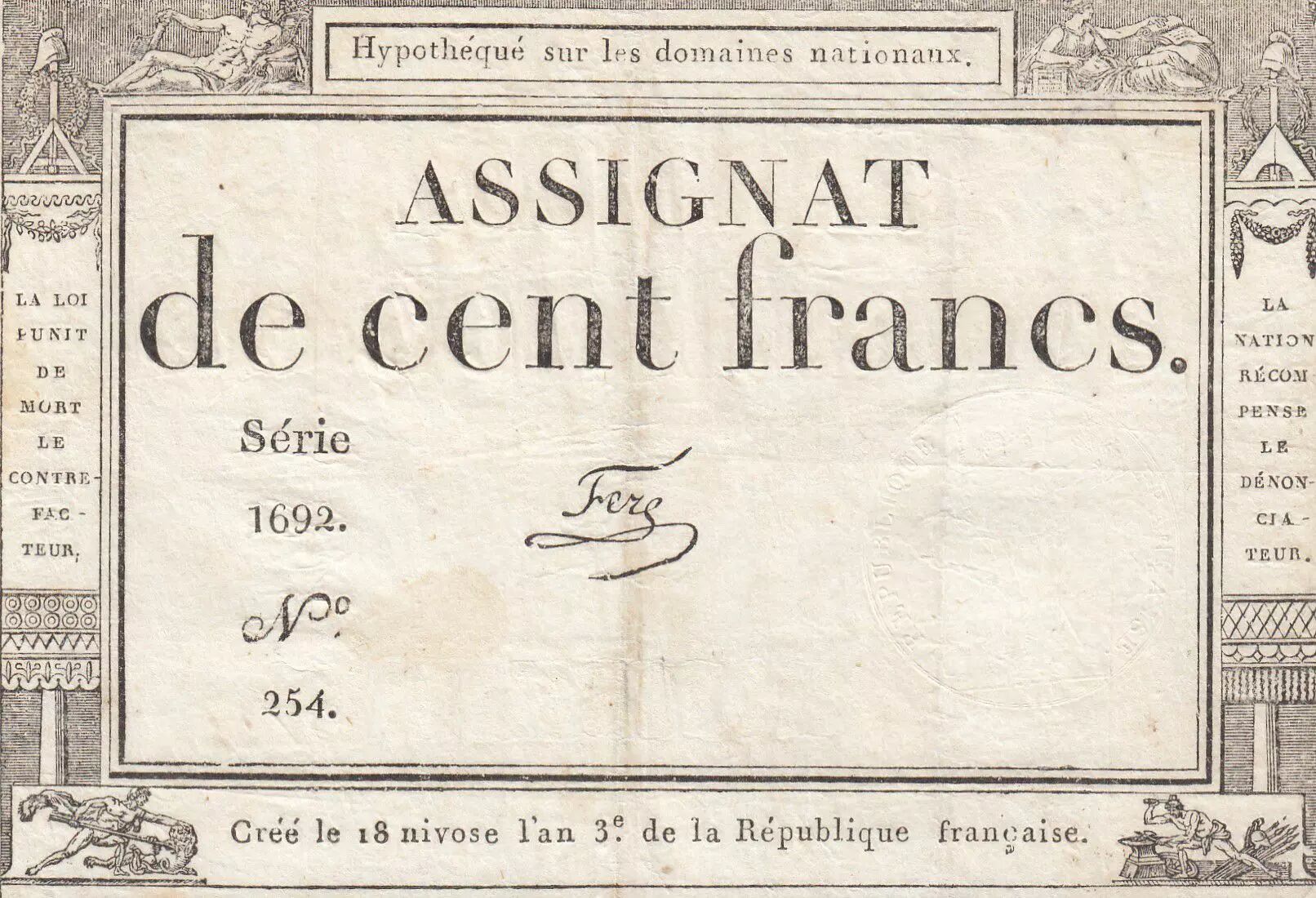 Banknote France 100 Francs - 18 Nivose An III - (07.01.1795) - Sign. Feze - Serial 1692