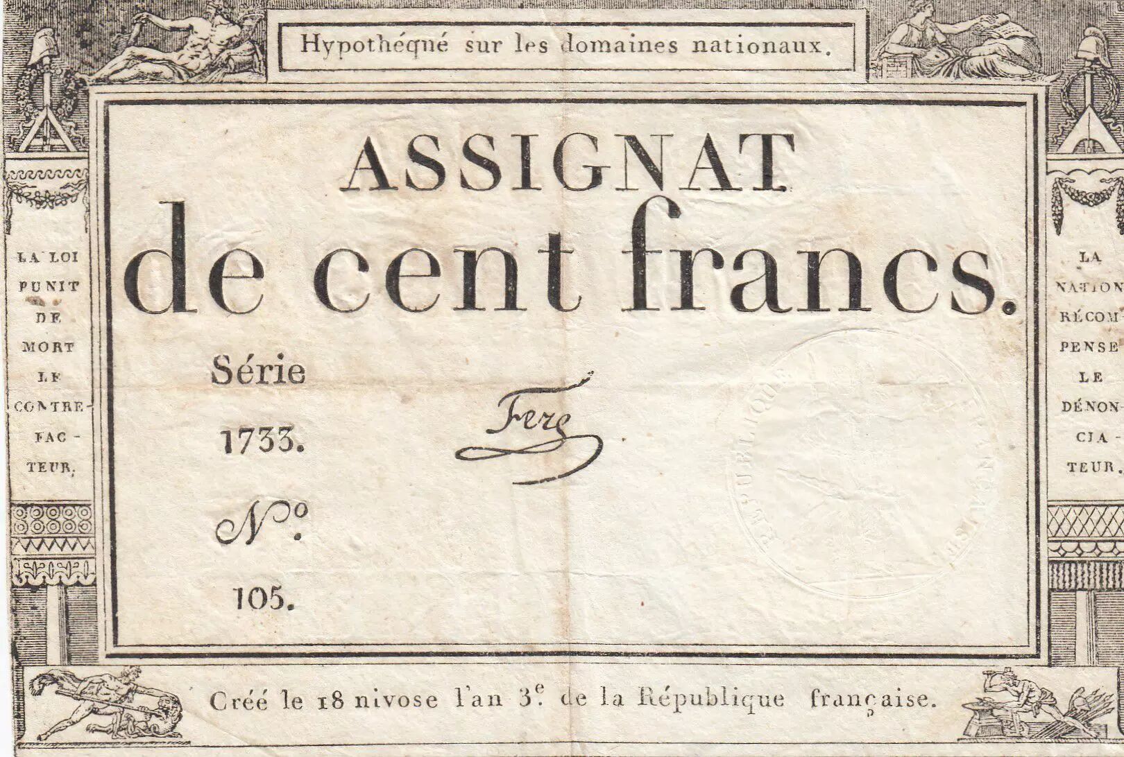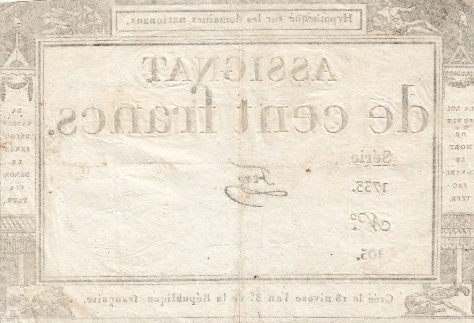 Banknote France 100 Francs - 18 Nivose An III - (07.01.1795) - Sign. Feze - Serial 1733