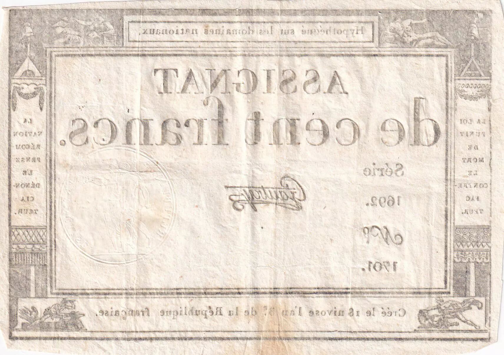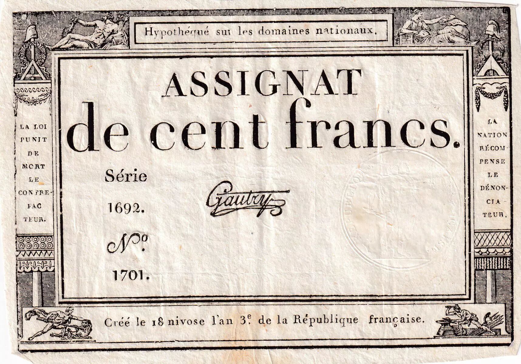 Banknote France 100 Francs - 18 Nivose An III - (07.01.1795) - Sign. Gautry - Serial 1692 - P.78